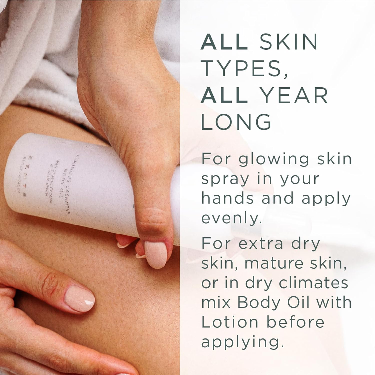 - GLOWING SKIN. Soften and restore your skin with a beautiful blend of coconut oil, passionflower and antioxidant-rich vitamin E. Spray all over the body or add to lotion for an irresistibly sexy sheen with a lightweight, elegant scent.