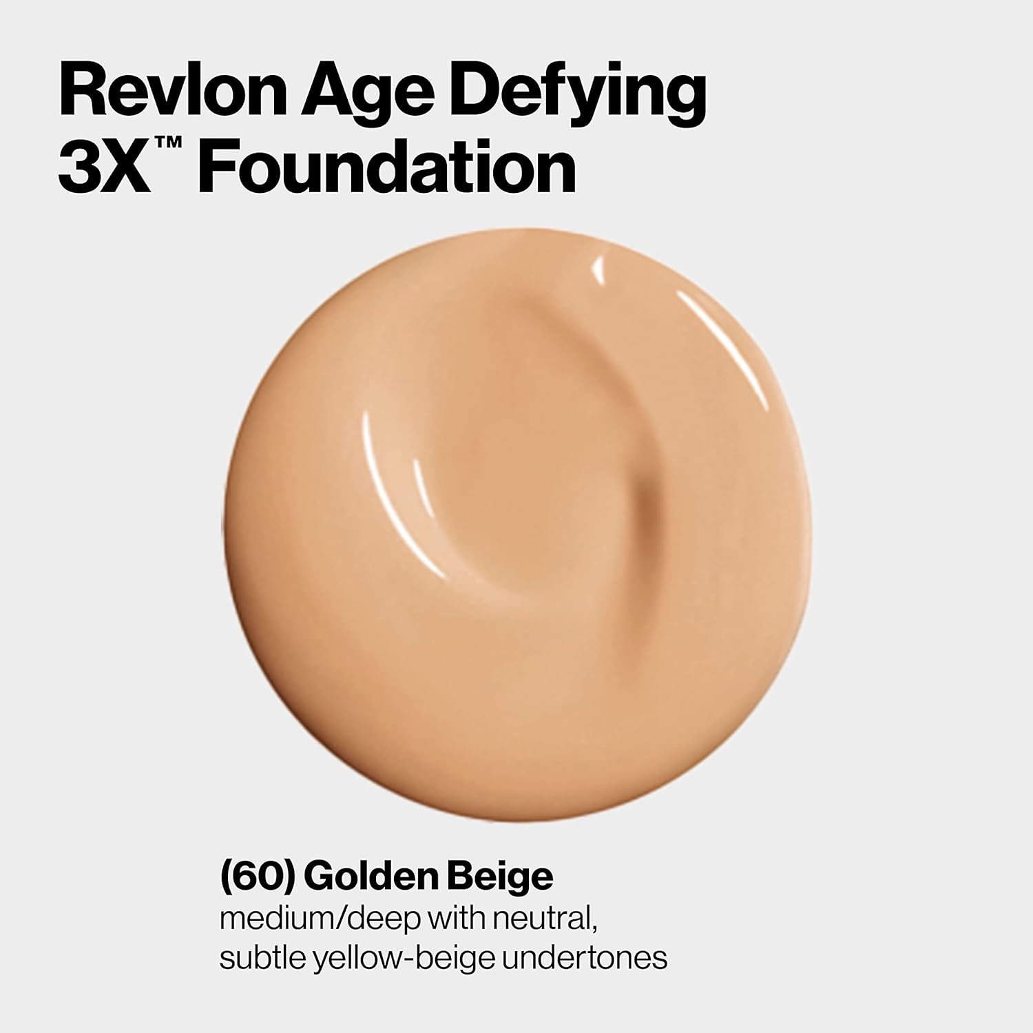 Revlon Age Defying 3X Makeup Foundation, Firming, Lifting and Anti-Aging Medium, Buildable Coverage with Natural Finish SPF 20, 060 Golden Beige, 1 fl oz