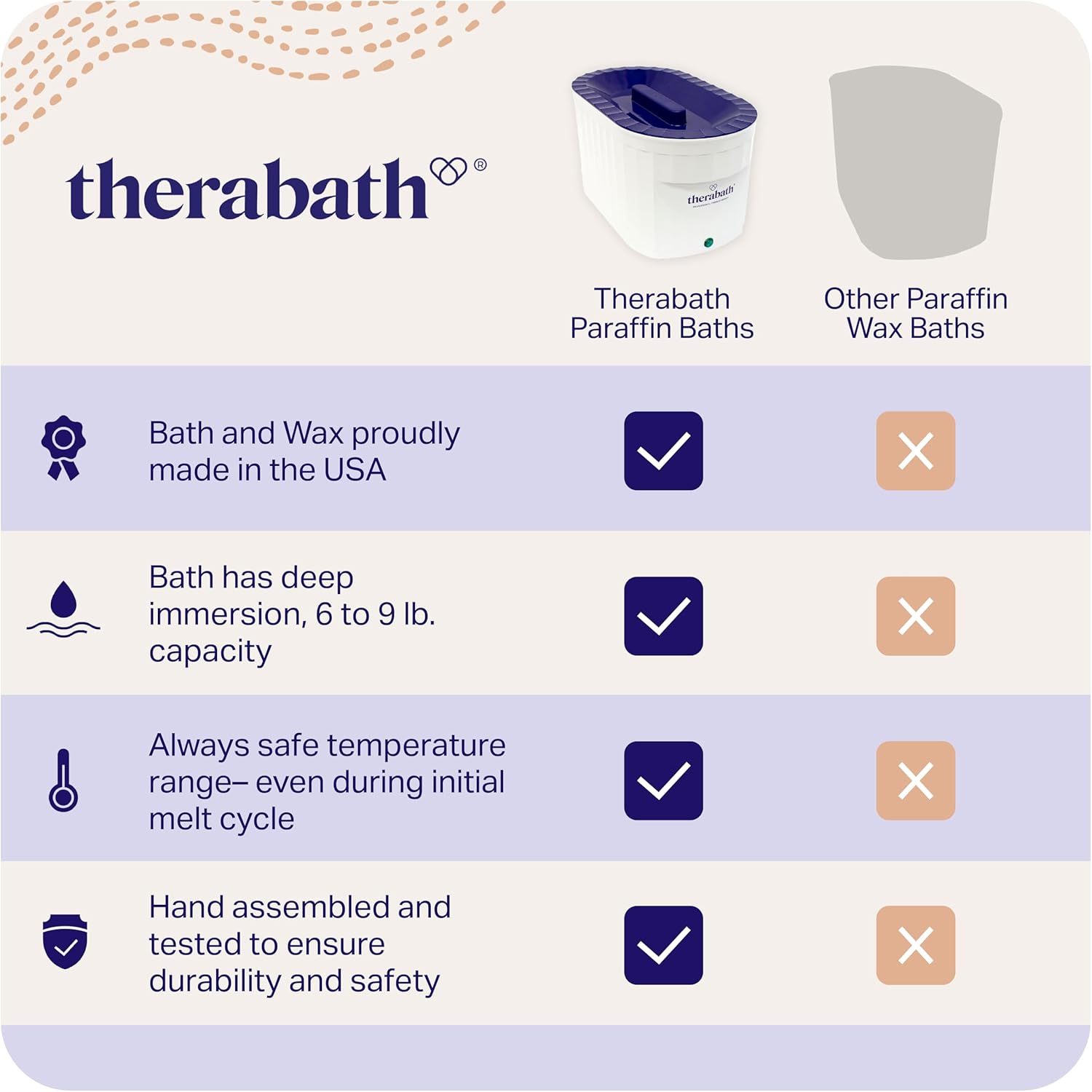 - The Comfort You Deserve. You deserve the best therapy options available when managing discomfort. As a form of thermotherapy, Therabath paraffin wax treatments are clinically proven as a treatment for arthritis but are also used to moisturize skin and provide warming comfort. Therabath aims to support you on your journey to relief with uncompromising commitment to quality and safety.