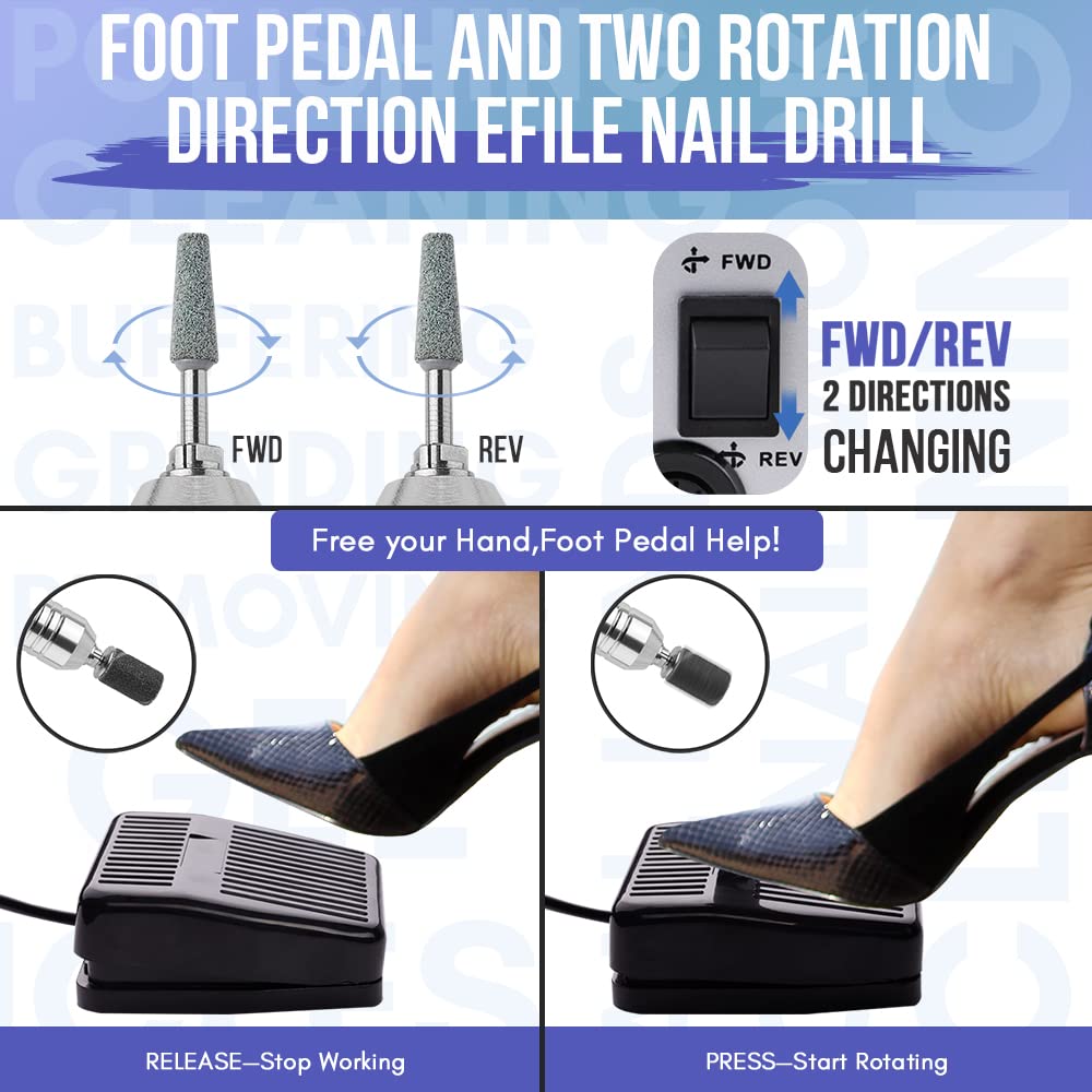 - Foot Pedal and Two Rotation Direction Efile Nail Drill: Two directions for left-hand and right-hand use. This nail files for acrylic nails is equipped with the F-Forward and R-Reverse buttons to change the direction of the rotating bit, which enables any right-handed or left-handed use. βHandβ mode and βFootβ mode for you to choose and better meet your requirement.