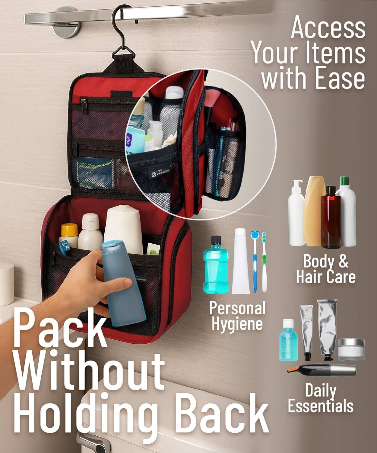 • Convenient Hanging Hook: The XXL metal swivel hook allows you to hang the bag anywhere, saving valuable counter space. It's perfect for use in hotels, bathrooms, or even on a camping trip.