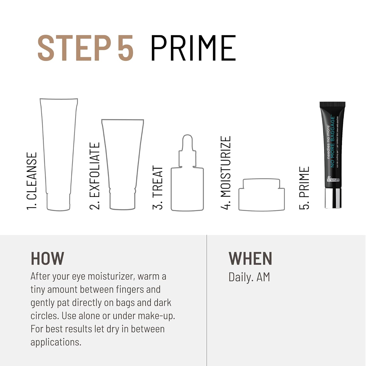 - Dr. Brandt Needles No More No More Baggage Eye De-Puffing Gel. An advanced eye solution that quickly minimizes the look of under-eye bags, puffiness and dark circles for a fresh, rested look. It protects against damage-causing irritants and pollutants.