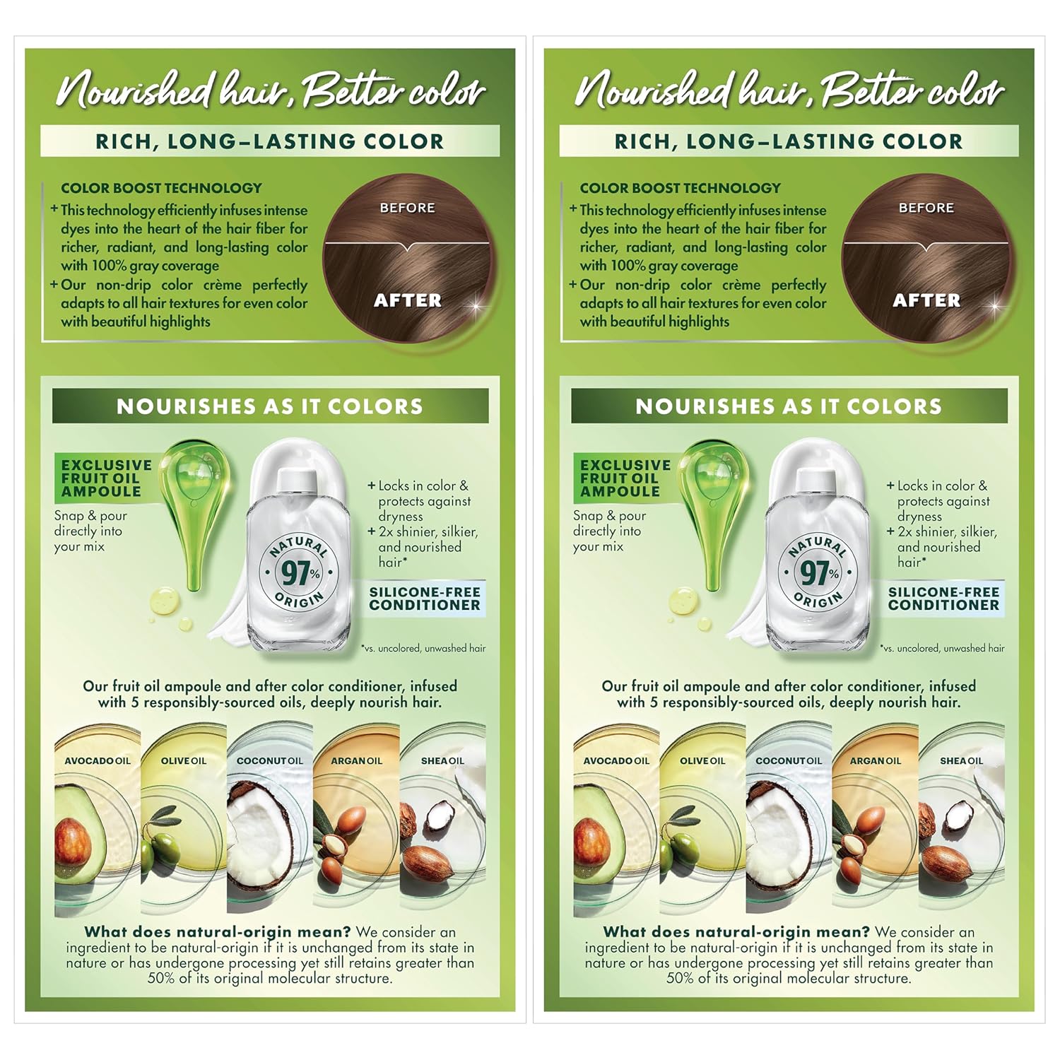 - Hair Dye Kit: The only hair color with a separate fruit oil ampoule that you snap & pour directly into the mix; Follow hair dye with our after color hair conditioner, infused with a blend of 5 fruit oils: avocado, olive, shea, argan & coconut oil