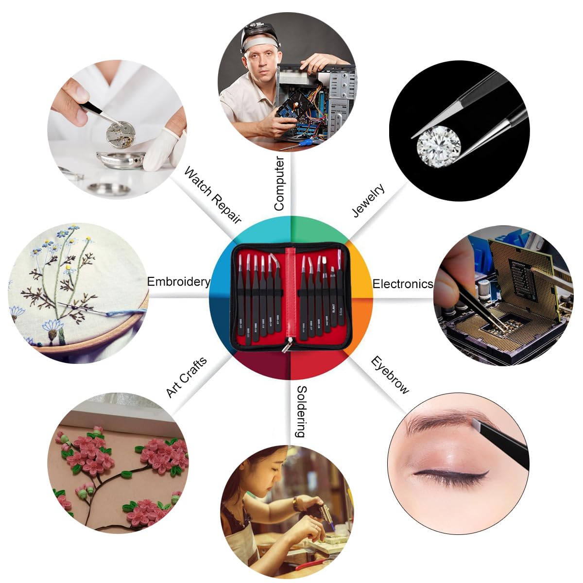 - Grab hold of whatever you want! This multifunctional tweezers set has 12 types of tweezers, which suit for Electronics Repair, Craft, Jewelry, Soldering, Lab work, Model making, Stamp or coin collecting, Weeding vinyl design, Ingrown hair removal, Eyelash extension, Eyebrow removal, Paper Sculptures, Embroidery, Phone repair, Watch repair, Cameo, Diamond Painting, eyeglass, apparatus, etc.