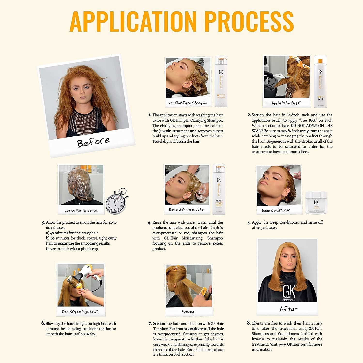 - NO WAITING TIME TO WASH AS NORMAL: There is no wait days after the application to be allowed to wash your hair again. This GK Hair Keratin treatment The Best kit also known as Brazilian keratin treatment comes with 100ml/3.4oz Ph+ Clarifying shampoo, GK Hair The Best Keratin Treatment, GK Hair Moisturizing Shampoo, GK Hair Moisturizing Conditioner and Deep Conditioner 20ml sachet Stop buying Frizz products that work for one day.