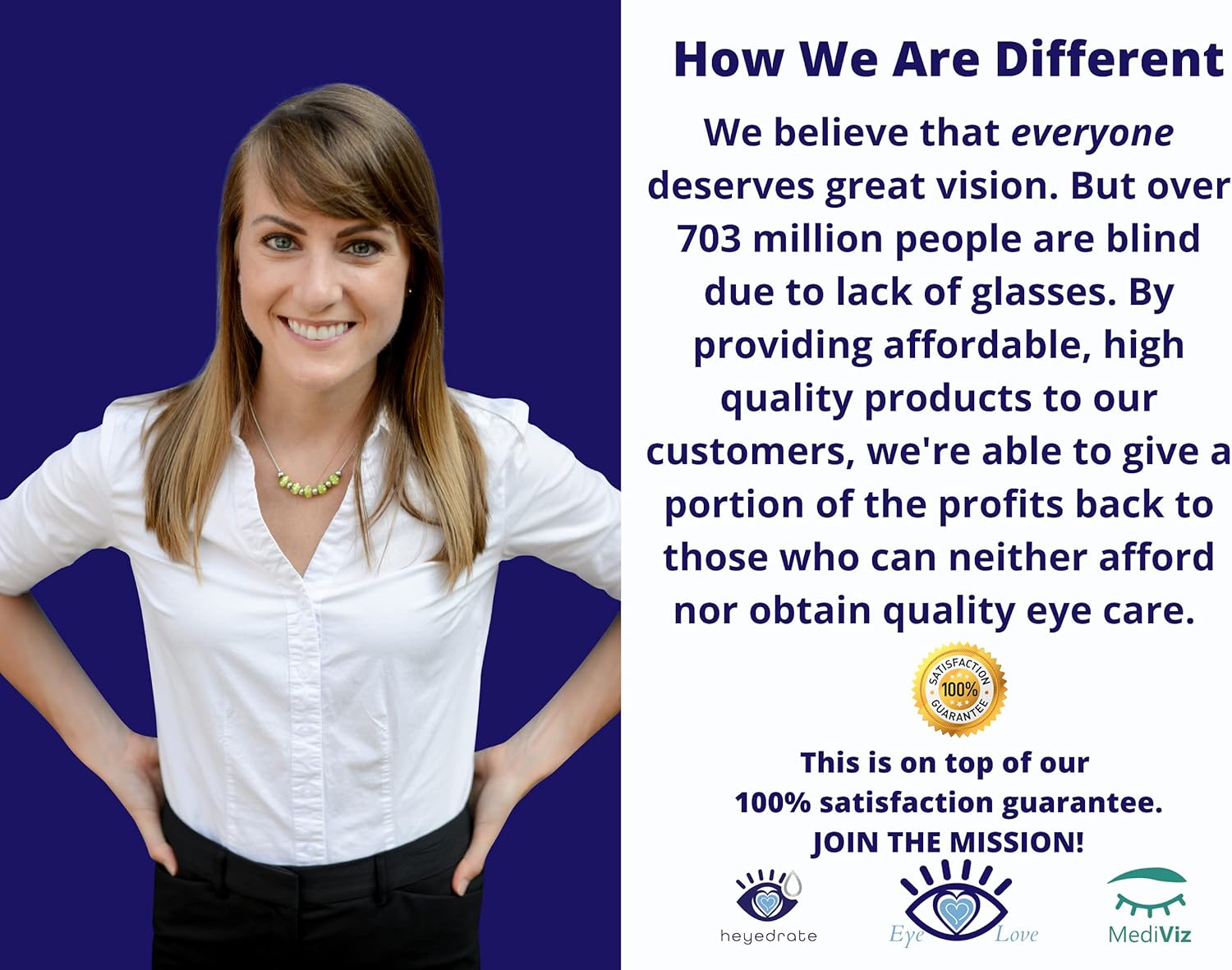 - How We Are Different - For every eye mask sold, we give an eye exam, sunglasses, and glasses to someone in need. This is on top of our 100% satisfaction guarantee, which means that if you are not happy with your purchase, we will give you a full refund. JOIN THE MOVEMENT!