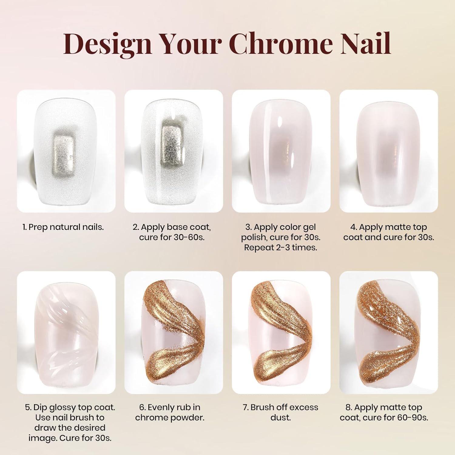 - Design Your Chrome NailοΌ1. Prep natural nails.2. Apply base coat, cure for 30-60s.3. Apply colorgel polish, cure for 30s. Repeat 2-3 times.4. Apply matte top coat and cure for 30s.5. Dip glossy topcoat. Use nail brush to draw the desired image. Cure for 30s. 6. Evenly rub in chrome powder.7. Brush off excess dust.8. Apply matte top coat, cure for 60-90s.