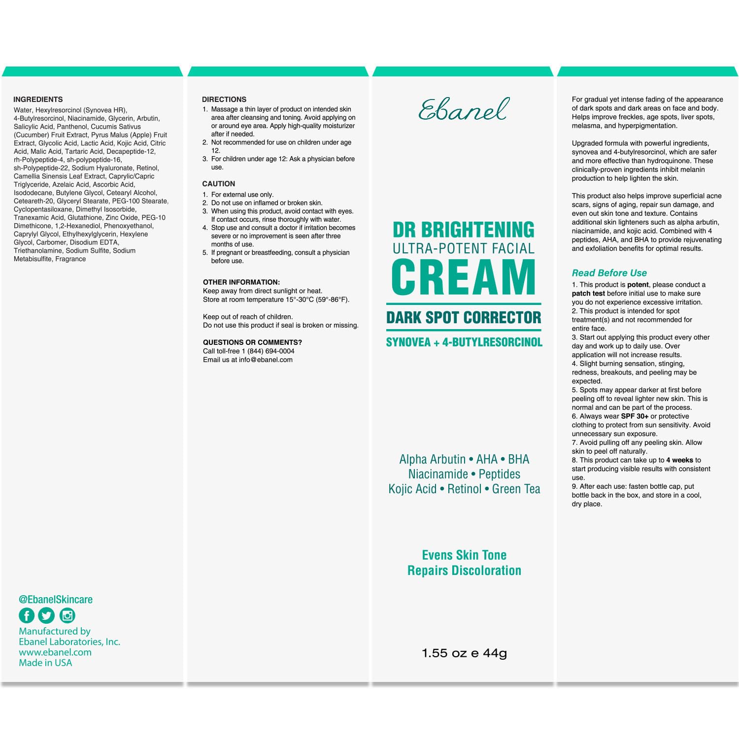 Ebanel Dark Spot Remover for Face & Body, Skin Brightening Cream with Synovea, Alpha Arbutin, Niacinamide, Kojic Acid, Dark Spot Corrector for Hyperpigmentation, Discoloration, Melasma, and Age Spots