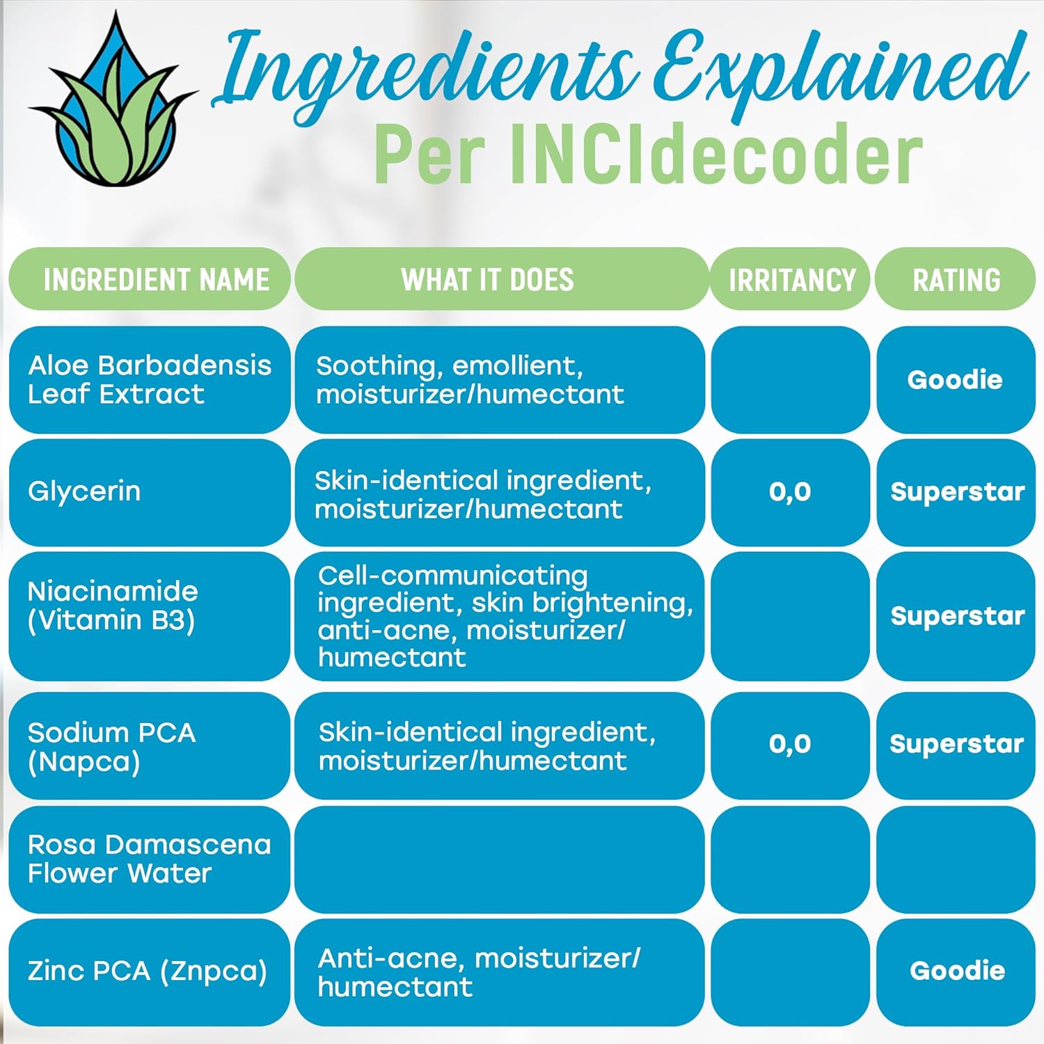 - PREMIUM INGREDIENTS include organic Aloe vera & Glycerin, Bioidentical vitamin Niacinamide, Sodium PCA & Zinc PCA with natural Rose water hydrosol. Beneficial for itchy skin, acne, oiliness, inflammation, psoriasis, sunburn and tattoo care.