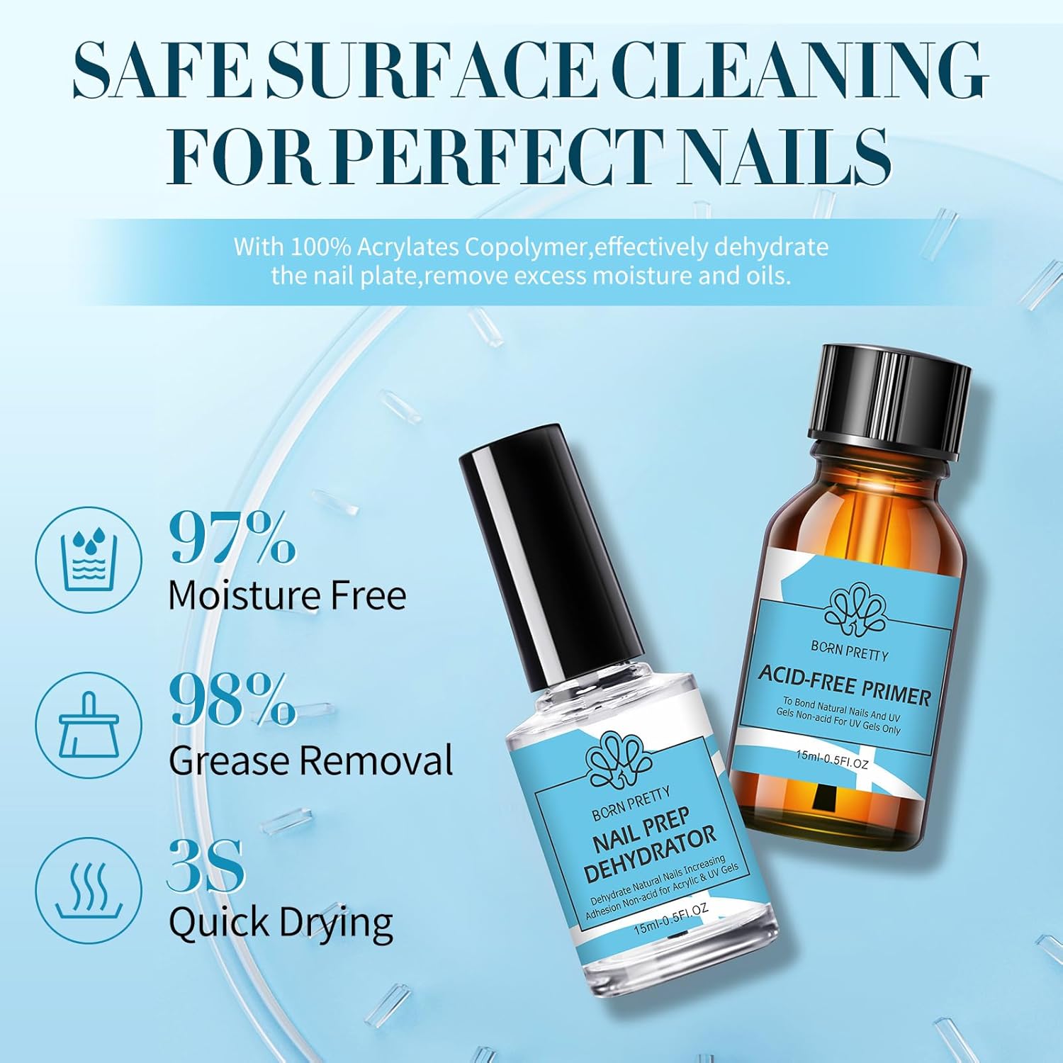 BORN PRETTY Natural Nail Prep Dehydrate and Bond Primer Acid-Free,15ml Dehydrator for Acrylic and Gel Nail Polish, Non Acid Primer for UV Gels Fast Dry Superior Bonding Agent Gift Box Set