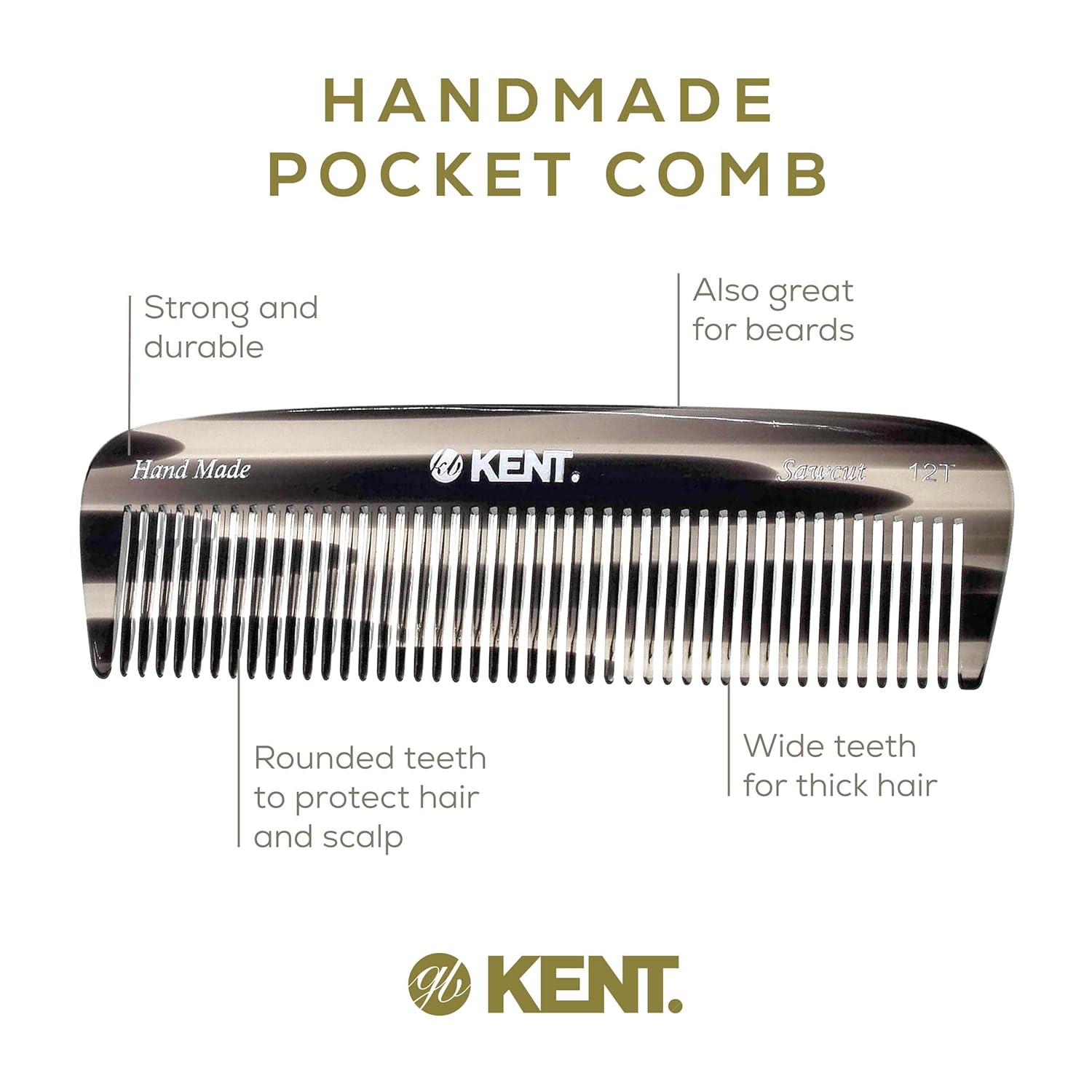 Kent 12T G Wide Tooth Detangling Comb - Handmade Pocket Comb for Thick, Curly, Wavy Hair - Large Tooth Hair and Beard Grooming Comb, Saw-Cut and Hand Polished