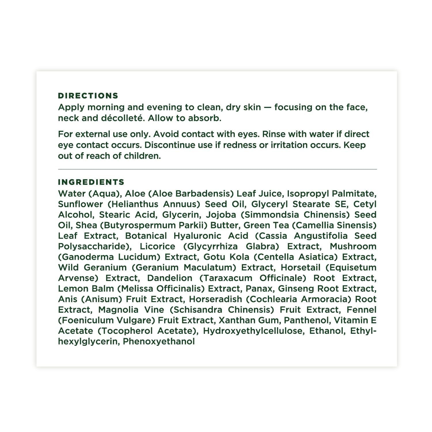 - Directions: Apply morning and evening to clean, dry skin β focusing on the face, neck and dΓ©colletΓ©. Allow to absorb.