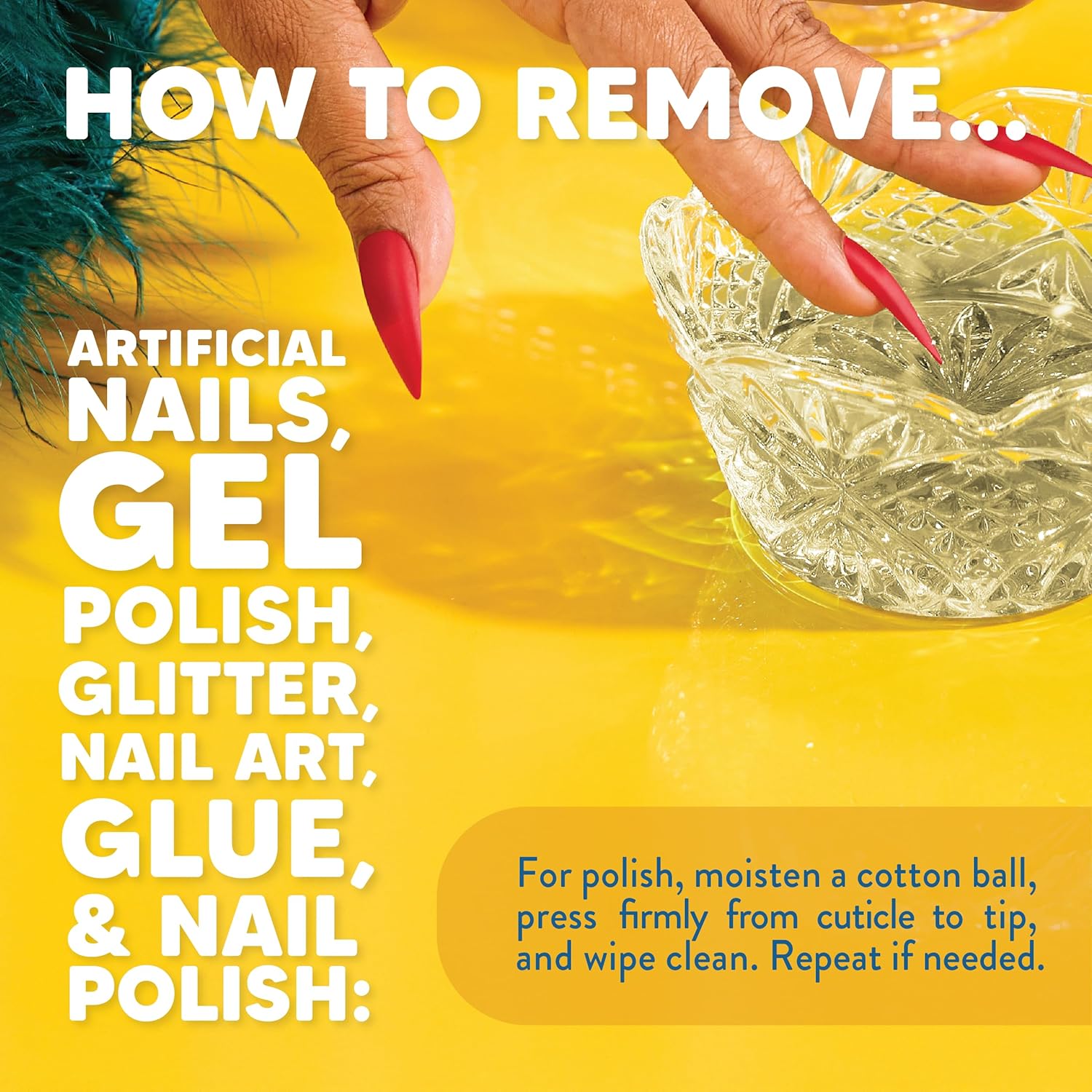 - Directions: Simply clip the artificial nails, and soak your fingers in a bowl of the nail remover for 15 minutes. Gently file down the softened product and soak for another 15. For regular polish, Moisten cotton balls and massage the nail bed