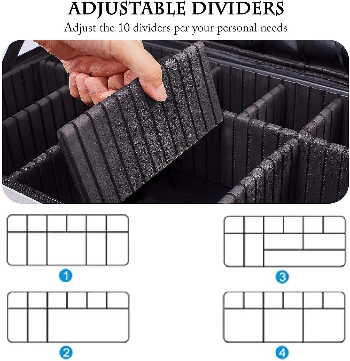 - Adjustable Compartments: This makeup bag has 10 adjustable EVA dividers and 12 makeup brushes slots. You can design the internal compartments by adjusting the dividers to fit different cosmetics and keep them perfectly separated and organized.