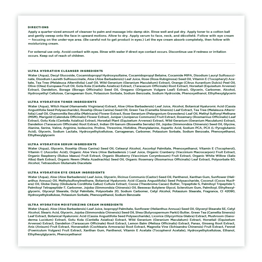 - Our full Ultra Hydration collection for your softest, smoothest skin yet: Ultra Hydration Cleanser is powered by aloe, vitamin E, rosehip, and sweet orange; Ultra Hydration Toner delivers a soothing dose of hyaluronic acid and clarifying witch hazel; Ultra Hydration Serum is packed with rich, moisturizing ingredients; Ultra Hydration Eye Cream smooths and soothes under-eyes; Ultra Hydration Moisturizing Cream provides an extra dose of nourishment for long-lasting hydration