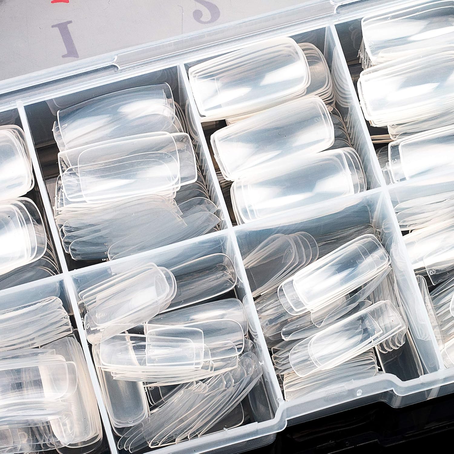 - Full-covered false nail tips, 500pcs nail tips, 10 different sizes, stored in numbered case with 10 small grid.