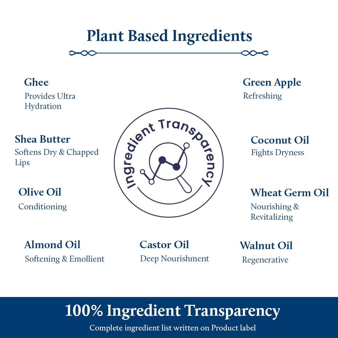 - WORKS AGAINST DRY CHAPPED LIPS: Richness of Green Apple extract and Ghee is known for its deep hydration properties. Contains Natural Vitamin C that helps in lips brightening and add gloss to it