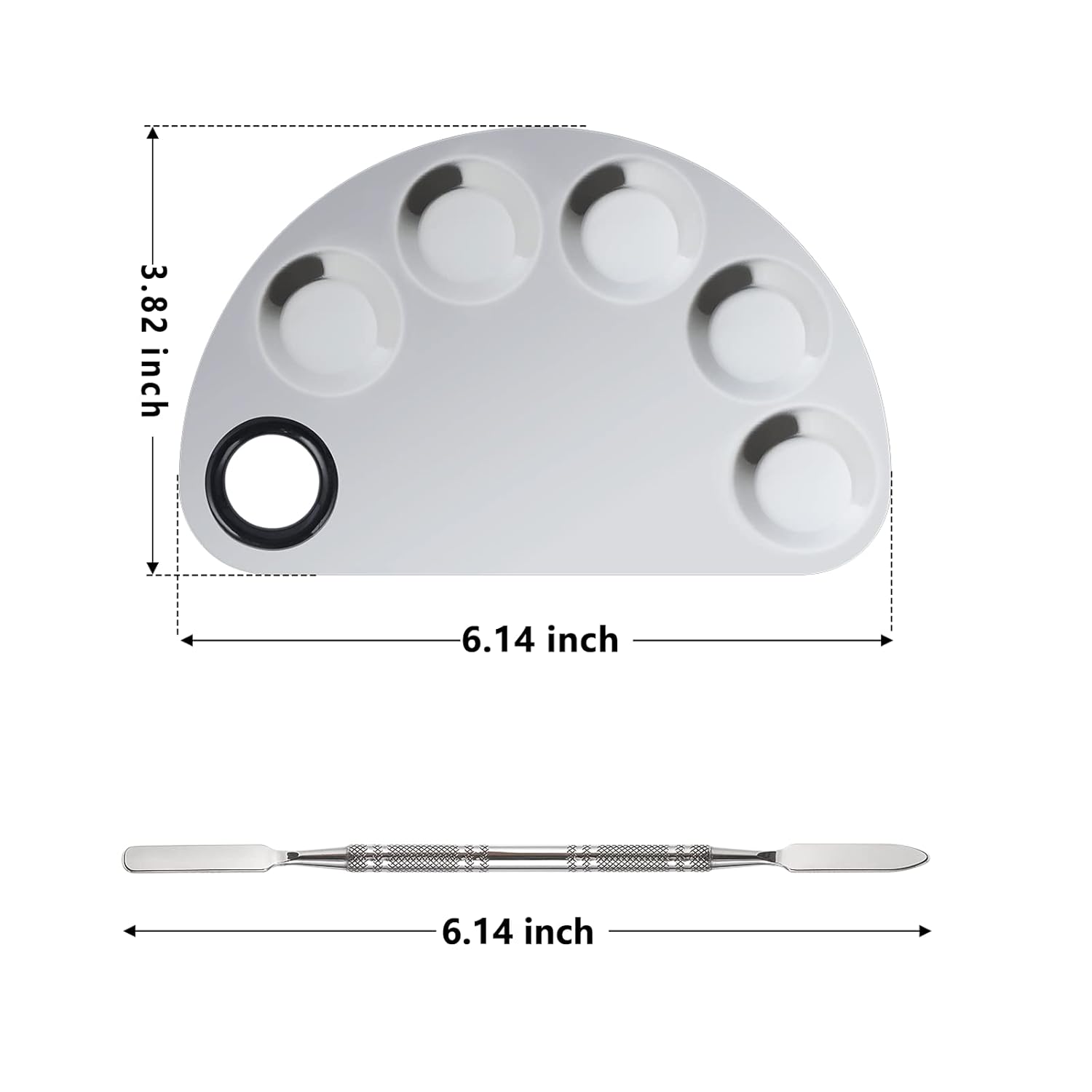 - 2.【Package Contents】:Package comes with one piece of semicircular makeup palette, which is 5-well fan shaped, and a double-ended spatula tool. Size of the item (L x W): Palette 6.14*3.82inches, spatula 6.14 inches.