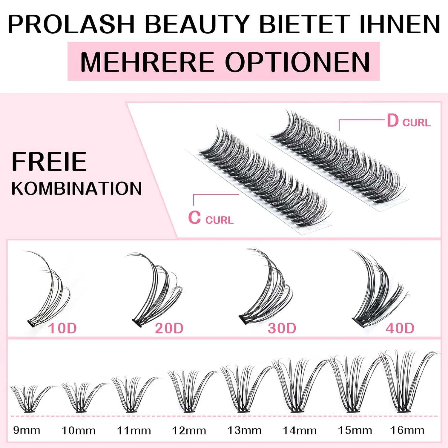 - Unique: The now very popular individual lashes are now available in PRO LashBeauty, and it is especially worth highlighting that PRO LashBeauty can provide 280 lashes in one tray! The blended lengths range from 9mm to 16mm, curls include C and D, and there are also have 10D, 20D, 30D, 40D, 10D+20D, 30D+40D. With a variety of styles for you to choose from. For the same price, you get more lashes and more uses.
