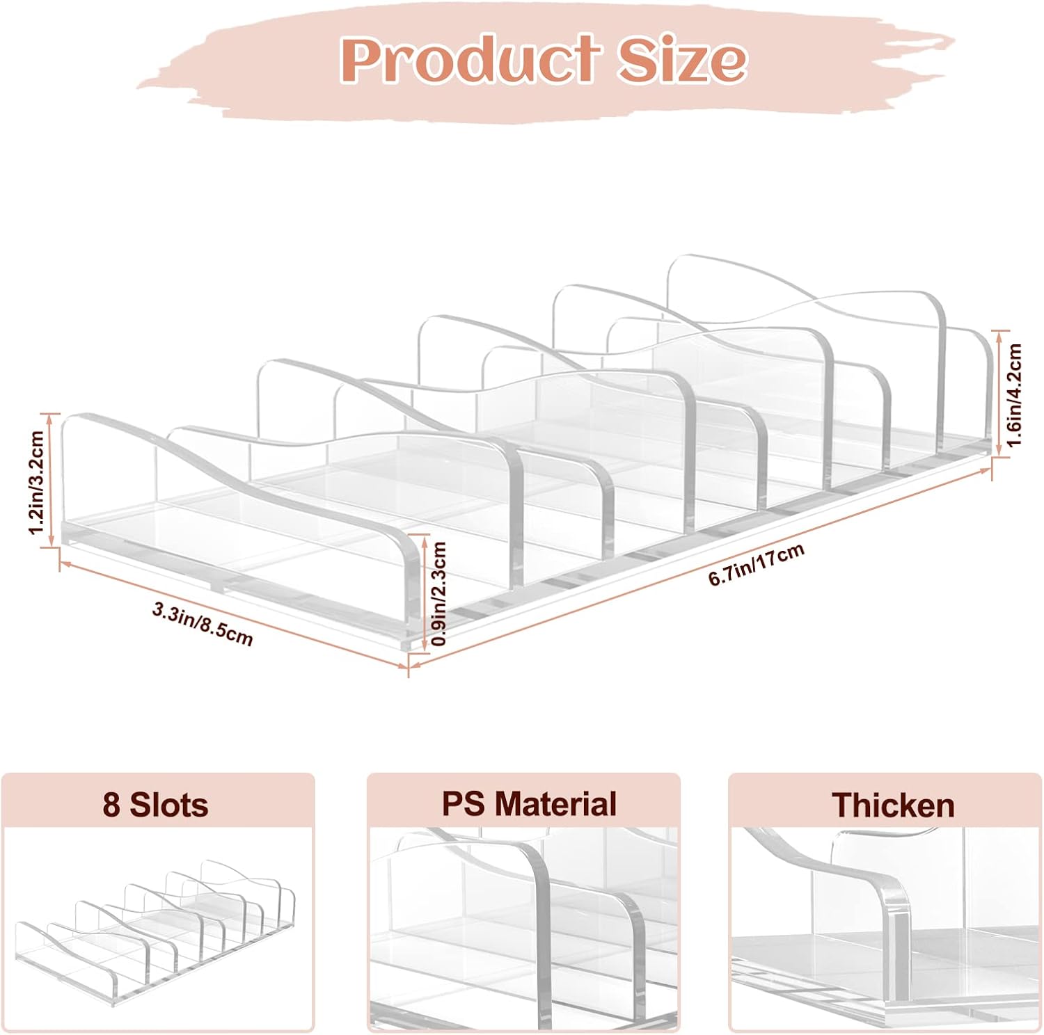- ă8 Compartments StorageăClear makeup palette organizer with 8 slots can help you to keep the countertop clean and tidy. They are sturdy and works well for holding your eyeshadow palettes.