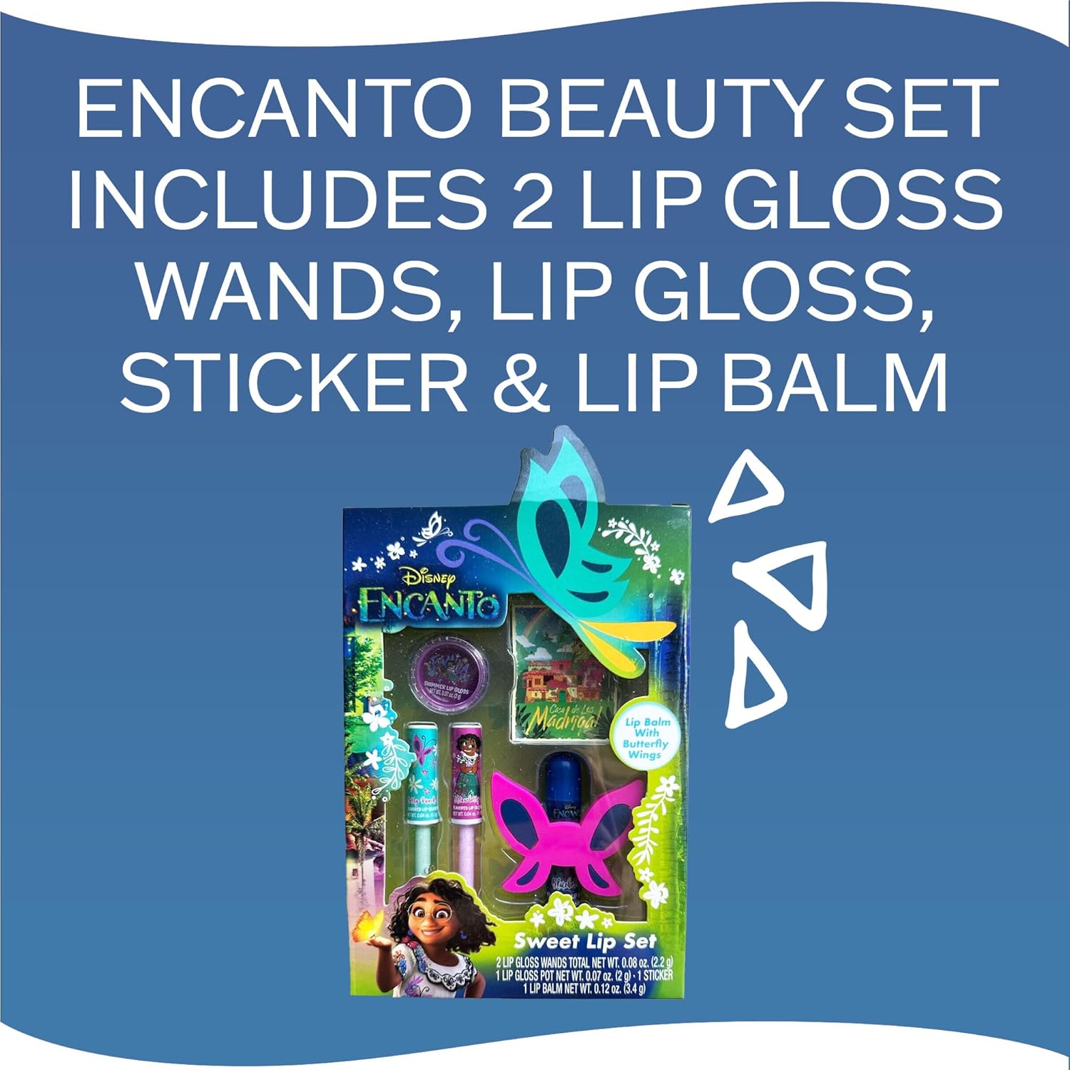 - FUN & FUNKY LIP GLOSS: Sparkle and express yourself with Encanto lip set. This glossy pack of girls’ lip makeup comes with 2 shiny lip gloss tubes, 1 glitter lip gloss pot, 1 lip balm with butterfly wings, and 1 cute sticker!