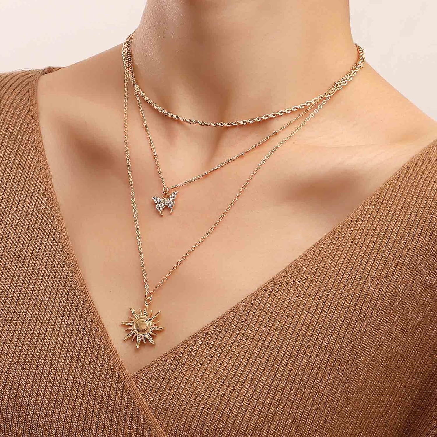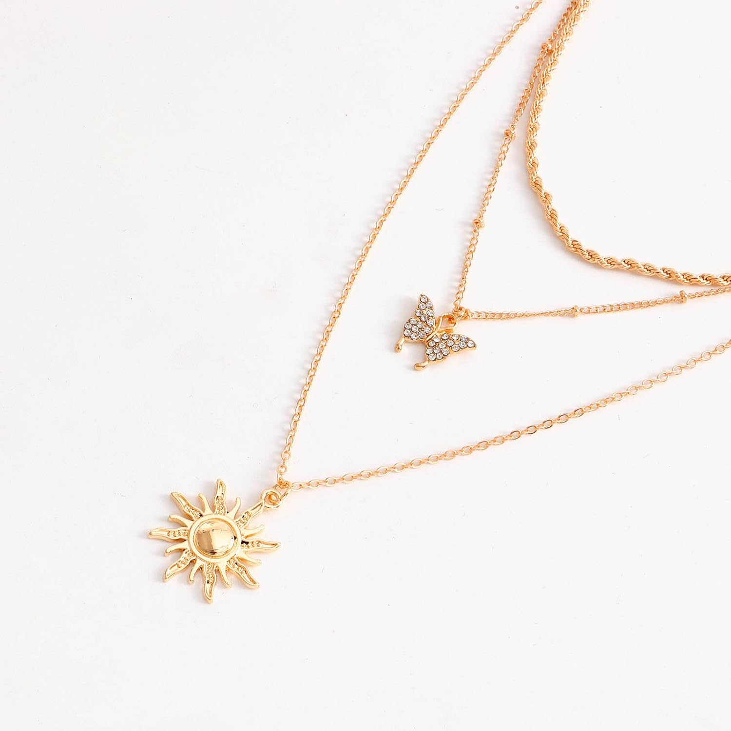 Bohemia Layered Sun Necklace Choker Crystal Butterfly Pendant Necklace Gold Rope Chain Necklace Vintage Sunflower Necklace Jewelry for Women and Girls