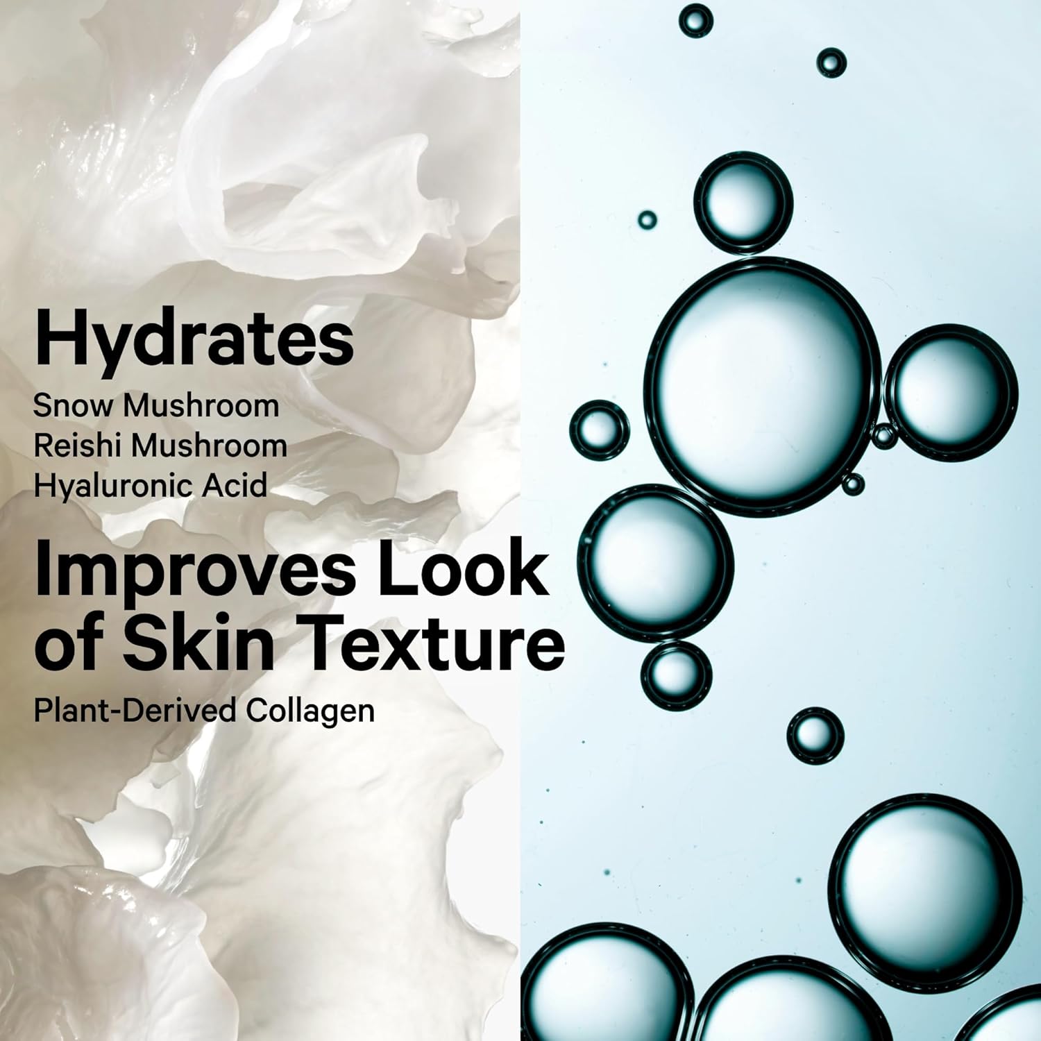 - Infused with vegan plant-derived collagen to help improve the look of skin texture, elasticity, and firmness, while snow mushroom, reishi mushroom, and hyaluronic acid hydrate to give you smoother-looking, plumper-looking skin.