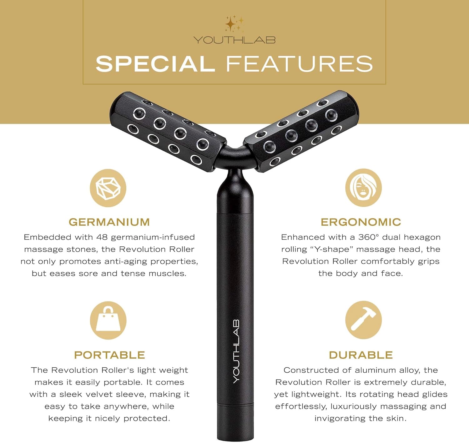 Revolution Roller - Germanium Stone Uplifting Face/Body Beauty Massage Tool/Roller/Wand for Skin Tightening/Firming, De-Puffing, Anti-Aging (Black)