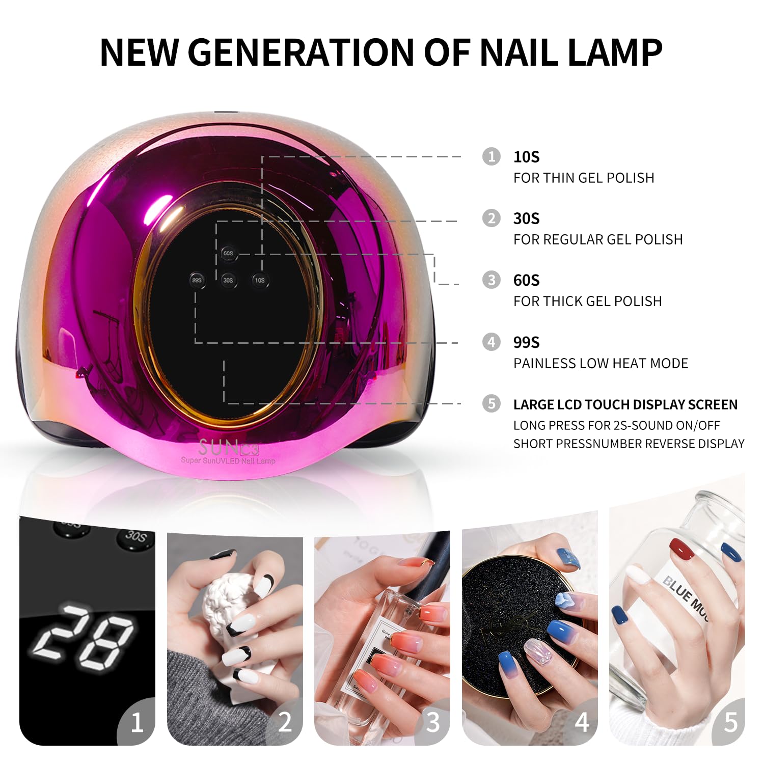 - 👍【High Power UV Nail Lamp】 MIRAGE LAYON professional UV LED nail lamp is upgraded to 288w maximum power--over 200% energy than other normal nail dryers. 63 UV+LED lights are scattered evenly on the top and sides of the lamp, can achieve 10 seconds quick drying without any blind area. It can work with all kinds of gels.Enjoy ideal professional salon nail art easily and freely at home.