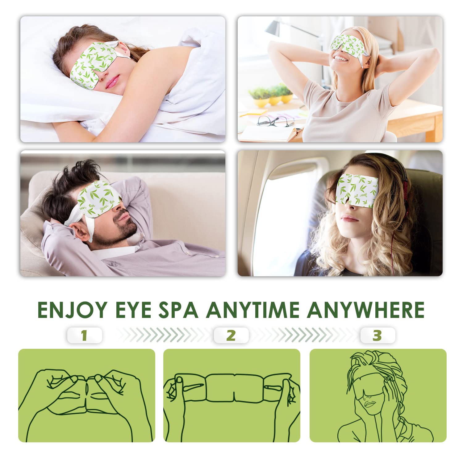 - ćNatural Ingredients, Safe to Useć: This green tea steam eye mask for sleep contains natural green tea extract, which is mild and very suitable for sensitive skin. You can feel the fresh green tea fragrance when you wear it, which can help you relieve daily stress and tension, let you relax your body and mind, and bring you a pleasant feeling. At the same time, it can refresh your mind. Using the green tea scented steam eye mask can reduce fatigue and increase your mental vitality