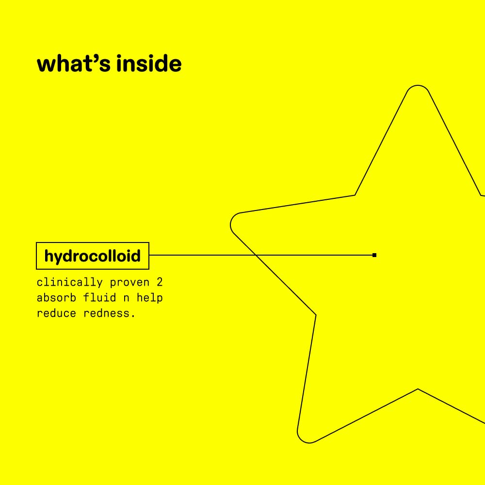 - A SINGLE INGREDIENT: Hydro-Stars have only one ingredient: hydrocolloid, a substance borrowed from surgical dressing thatβs clinically proven to improve the appearance of pimples overnight.