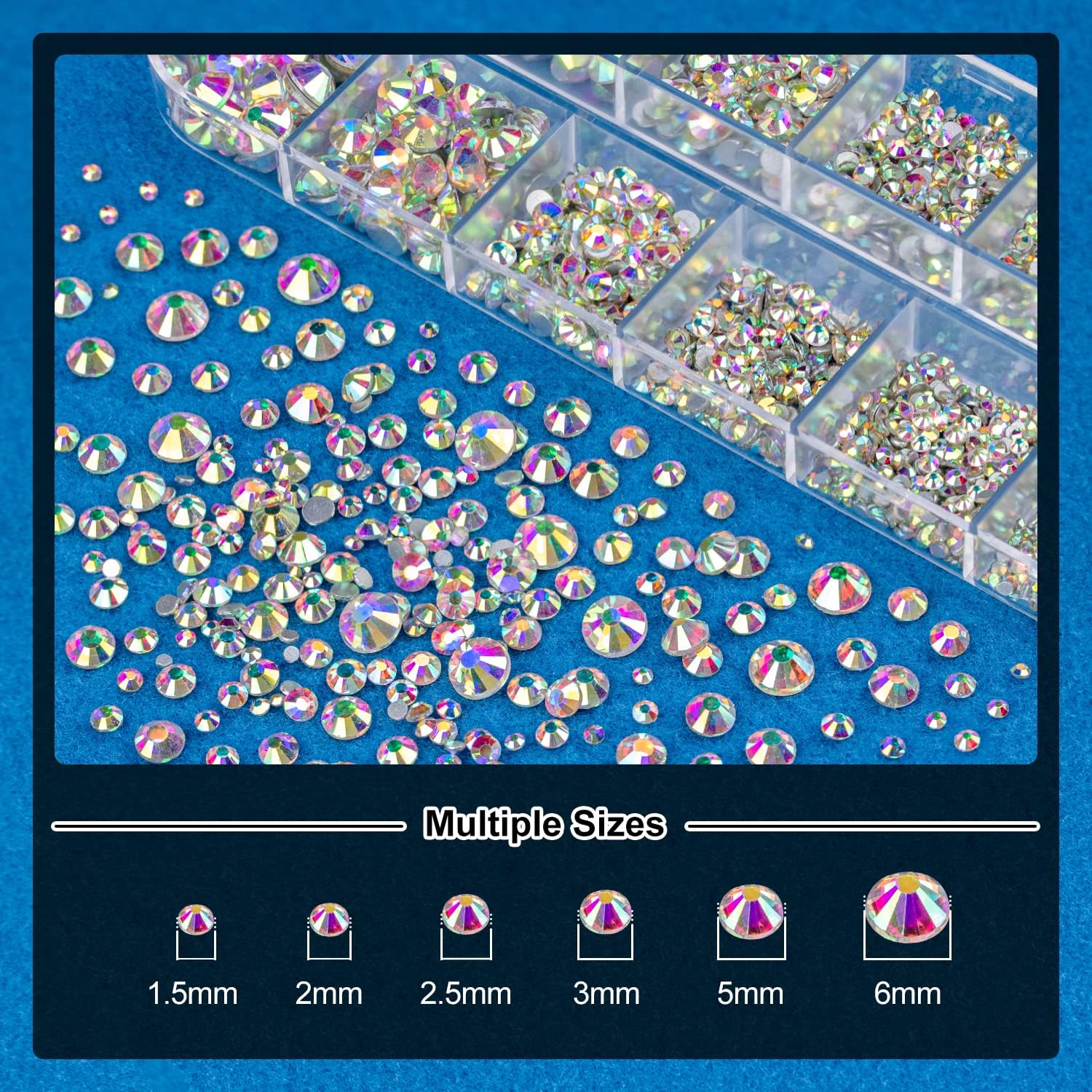 - 💎MULTI-SIZE: This set provides 1 box of Flat-back round glass AB rhinestones with 6 sizes: 1.5mm, 2mm, 2.5mm, 3mm, 4.5mm, 6mm. Great size range for your nail art decoration!