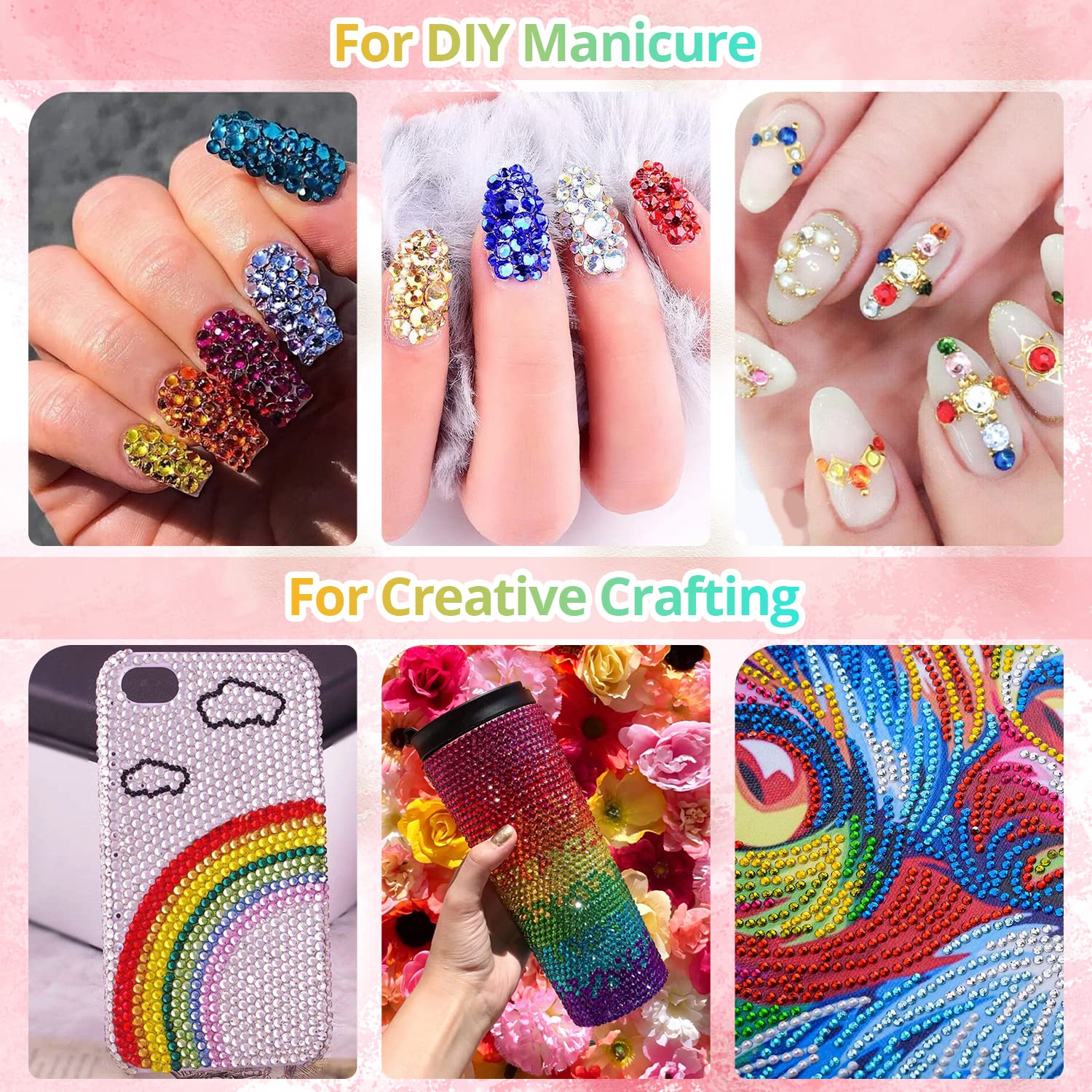 - 💎WIDE APPLICATION -- The sparkling crystal iridescent gems nail rhinestones are perfect for creating glittering face makeup & body art, 3D nail art or bedazzing jewelry, DIY crafts, wedding dress or shoes, cell phone cases, glasses, greeting cards, bags, guitars, scrapbooks etc.