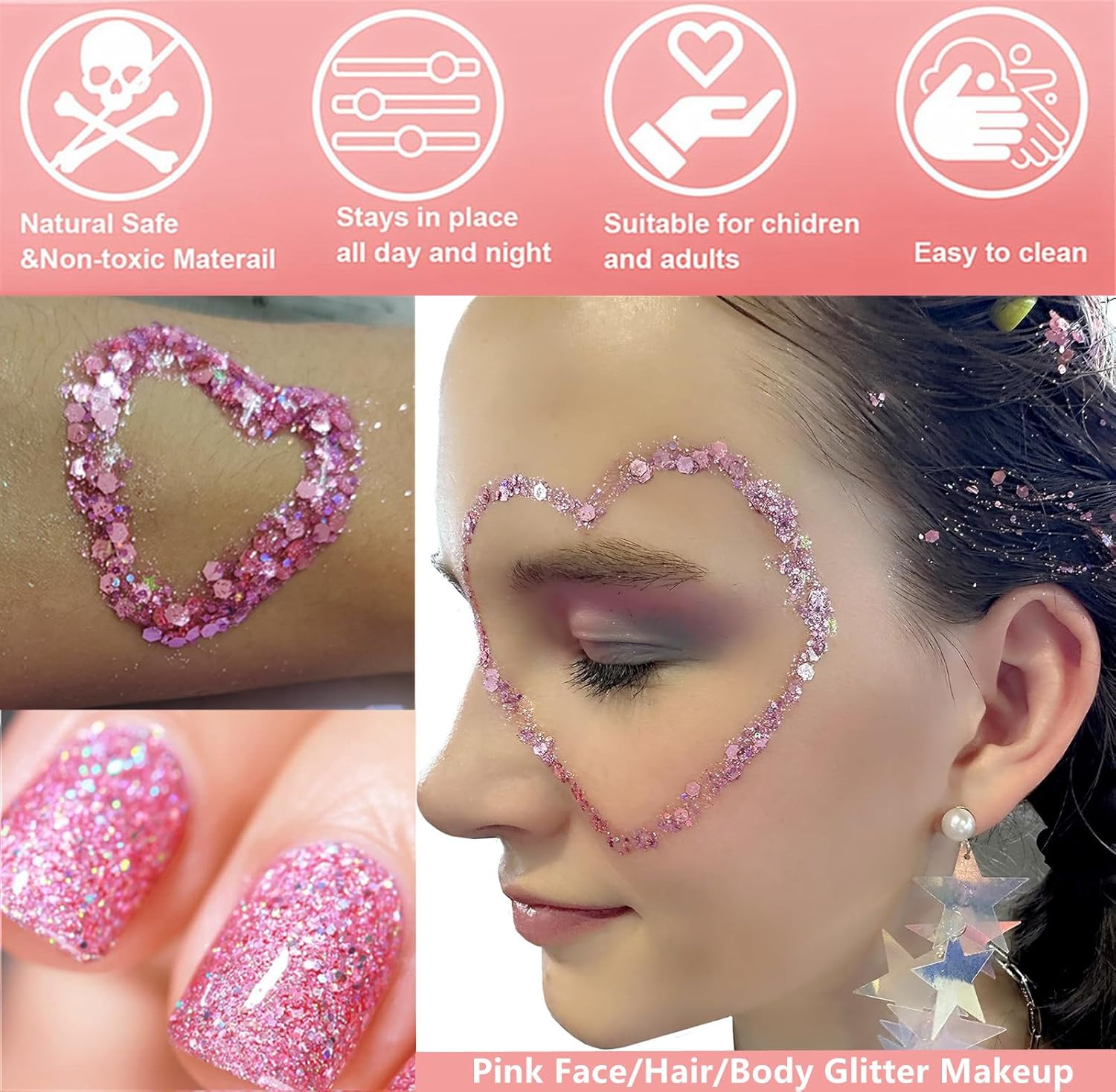 - 【Long Lasting Pink Glitter Makeup】Because of the sticky gel,a thin bit goes a long way.The flatter you lay it to skin the longer it holds.It takes some time to dry.After dried and it is set,it keeps shiny in the sun/light and will not drop at all.Great glitter music gift for disco outfit woman,long wearing last a whole night.