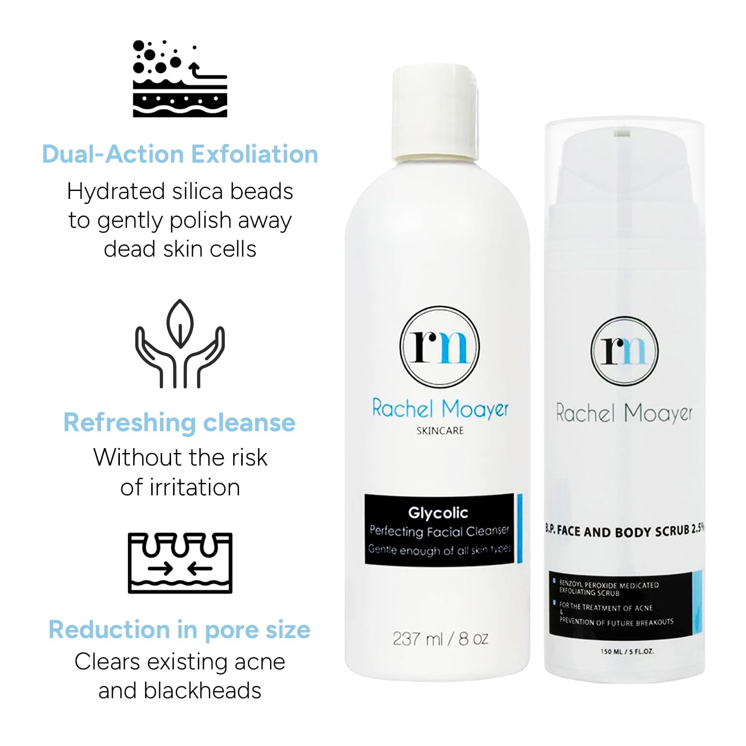 - Dual-Action Cleansing Power: Experience comprehensive skin rejuvenation with Rachel Moayer's Cleansing Essentials Bundle, featuring our Perfecting Facial Cleanser and BP 2.5% Face & Body Scrub; Engineered for all skin types, this duo deep cleans and exfoliates, revealing a brighter, smoother complexion