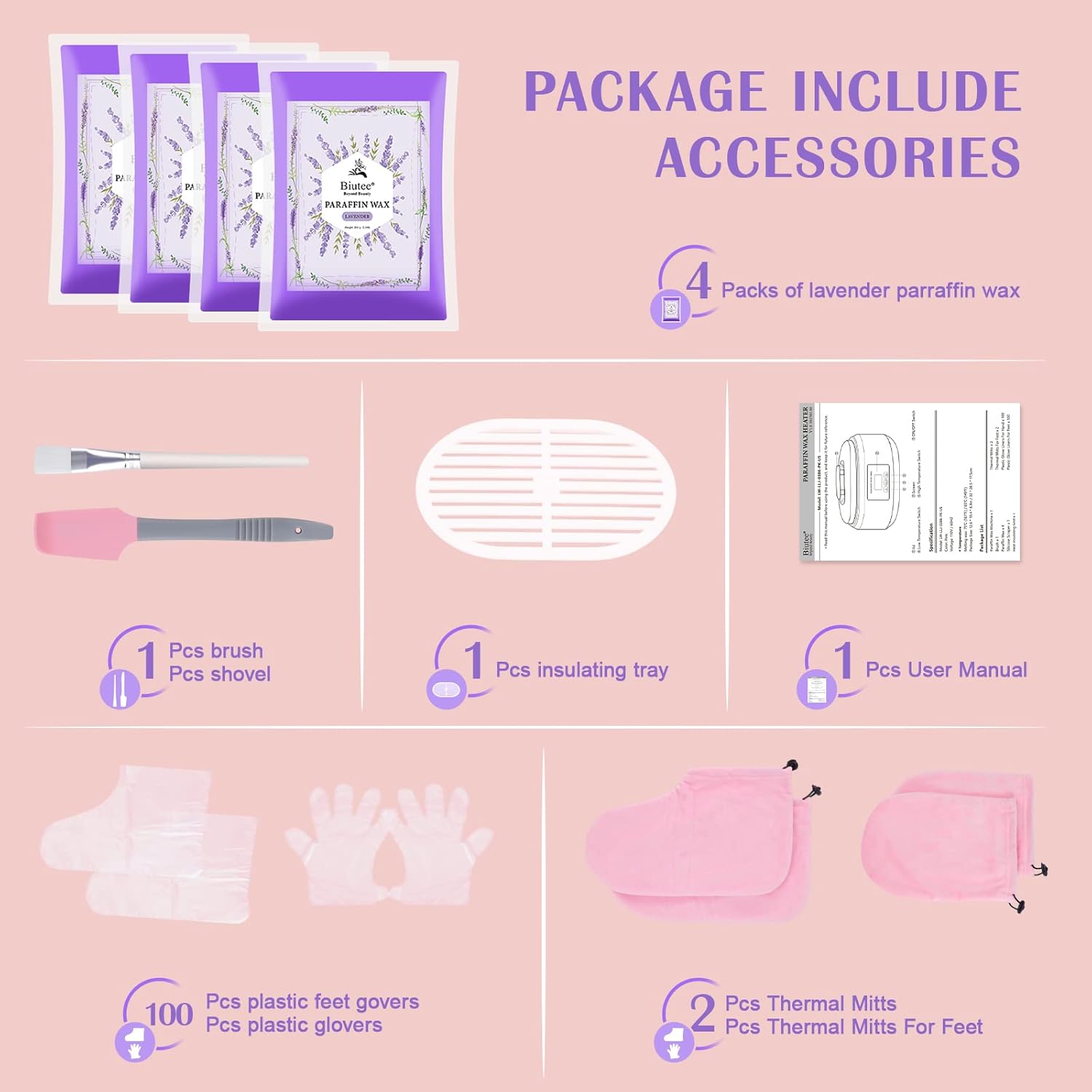 - 【Package】Our all-inclusive paraffin wax bath set comes stocked with 4 packs of lavender wax, cotton and plastic gloves, feet covers, and more accessories to help you soften your chapped skin.