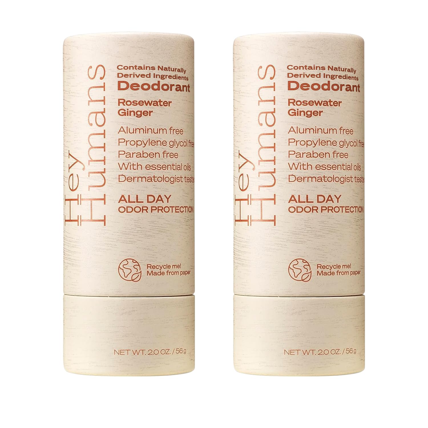 Hey Humans Deodorant, Aluminum Free Deodorant for Women and Men, Contains Naturally Derived Ingredients, All Day Odor Control, Refreshing Essential Oils, Pack of 2, Rosewater Ginger