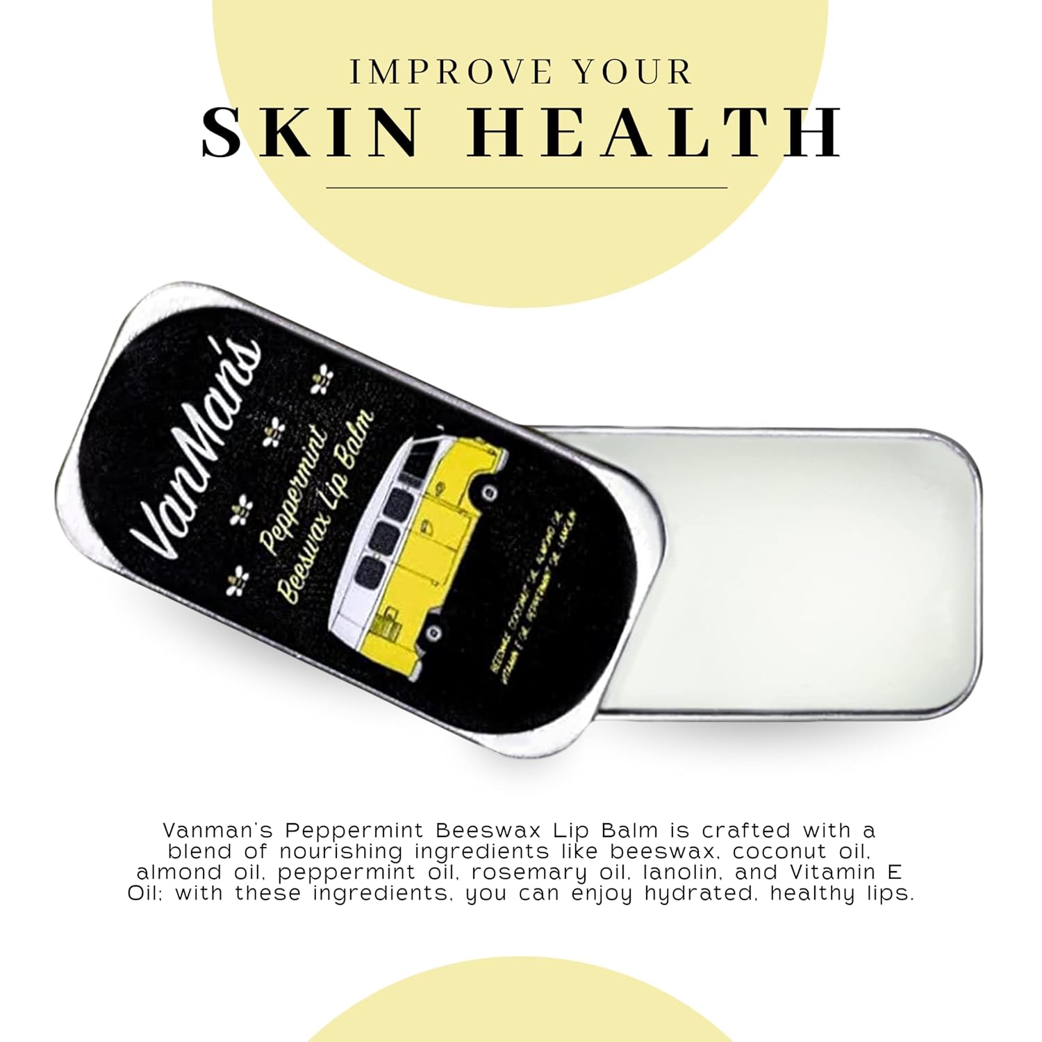 Vanman’s - Handmade Peppermint Beeswax Lip Balm (3 Pack) - Peppermint Lip Balm with Rosemary, Almond and Coconut Oil - Bee Balm with Vitamin E - Ideal for Dry Lips