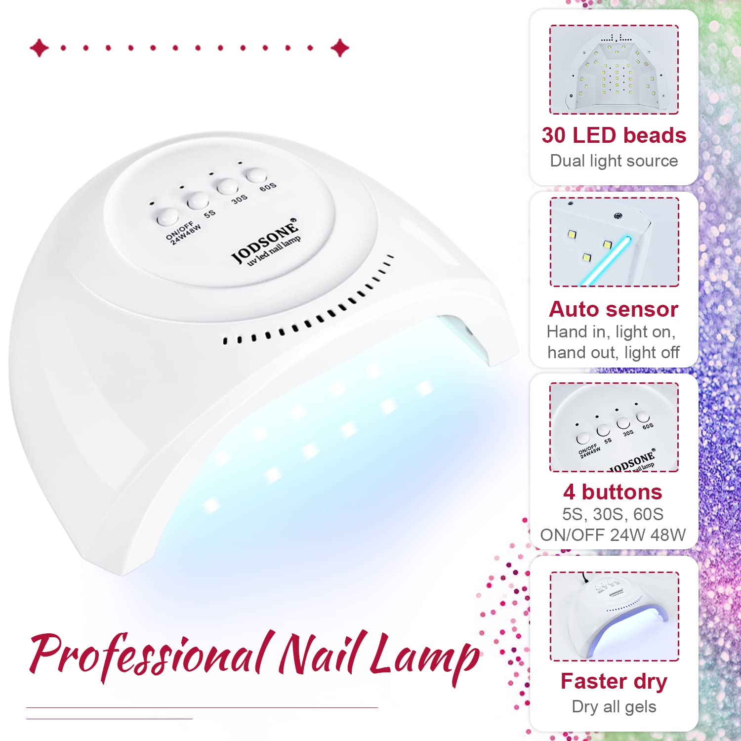 - Smart Nail Lamp: This manicure lamp has 30 small led beads, which can cure every finger comprehensively. Large space, you can put two hands at a time. And it has three curing modes, 5 seconds, 30 seconds and 60 seconds. Generally, under normal circumstances, gel nail polish can be quickly cured within one minute. But the cure time also depends on the amount of gel nail polish. With the nail lamp and correct operation, gel nail polish generally lasts for about 21 days..