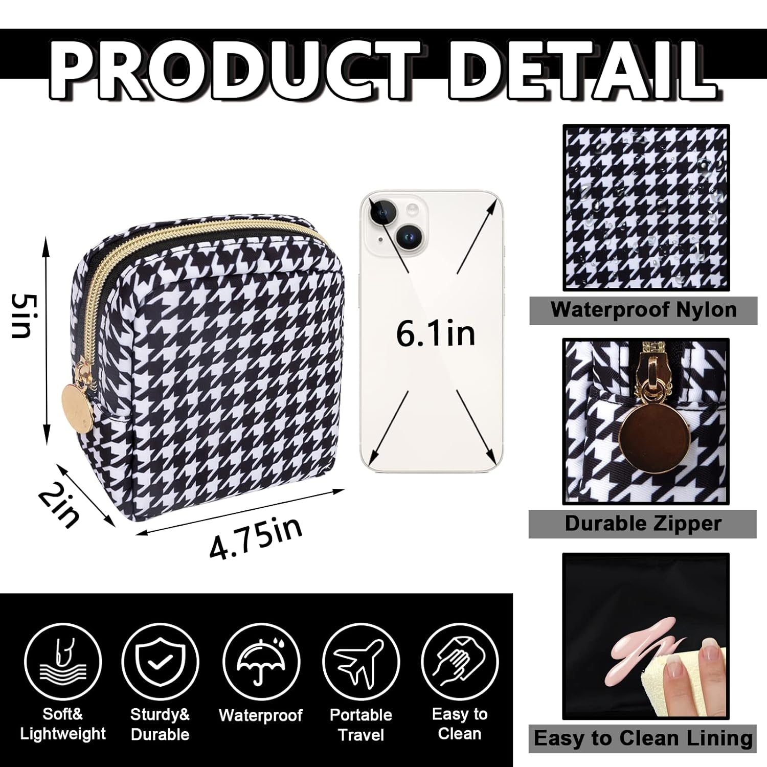 Mini Makeup Pouch for Purse, Small Cosmetic Bag Pouch Nylon Travel Toiletry Organizers for Women Girls, Cute Storage Zipper Pouch Coin Purse for School Work Camping(Mini-Houndstooth)