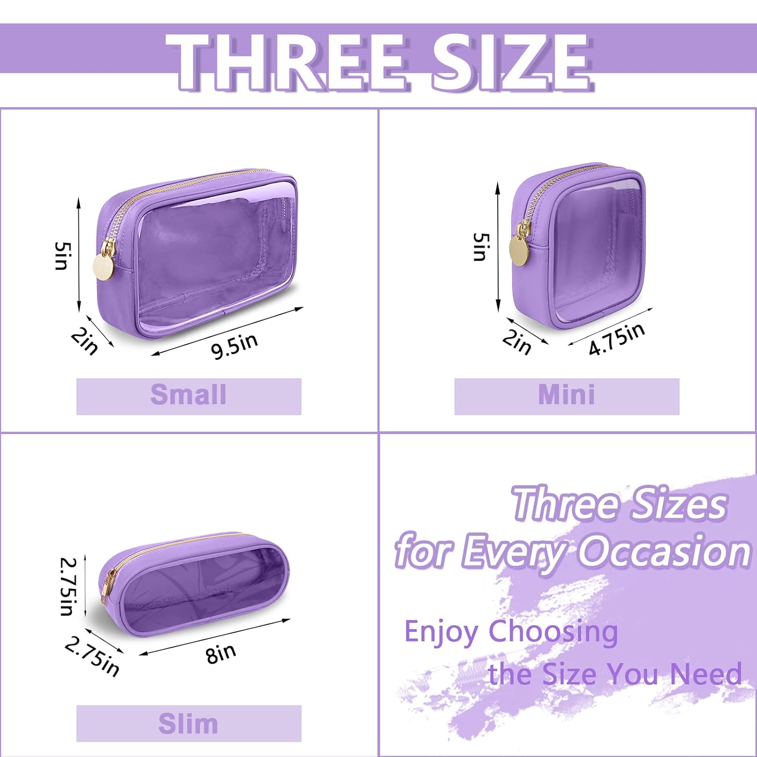- 【Multiple Options】The transparent makeup bag has three sizes, Mini(4.75''*2''*5''), Small(9.5''*2''*5'') and Slim(2.75*8''*2.75''). You can choose the right size according to the items you want to store. We have seven colors, Rose Red, Beige, Black, Blue, Green, Purple and Pink Heart. You can enjoy choosing the pattern you like.