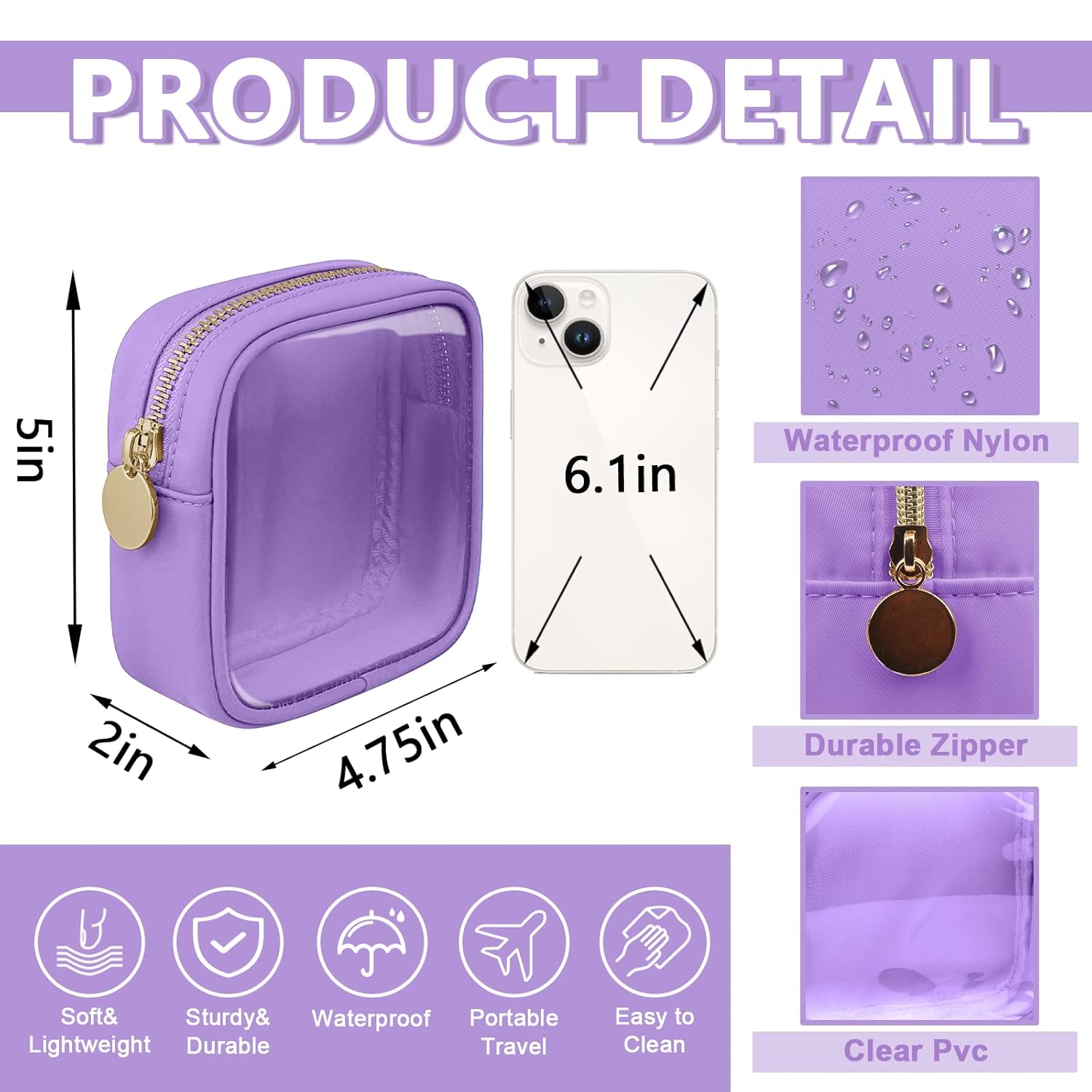 Clear Mini Makeup Bag for Purse, Small Nylon&PVC Cosmetic Travel Bag TSA Approved Toiletry Bag with Zipper, Preppy Transparent Makeup Travel Bag Coin Purse for Women Men Girls(Mini-Purple)