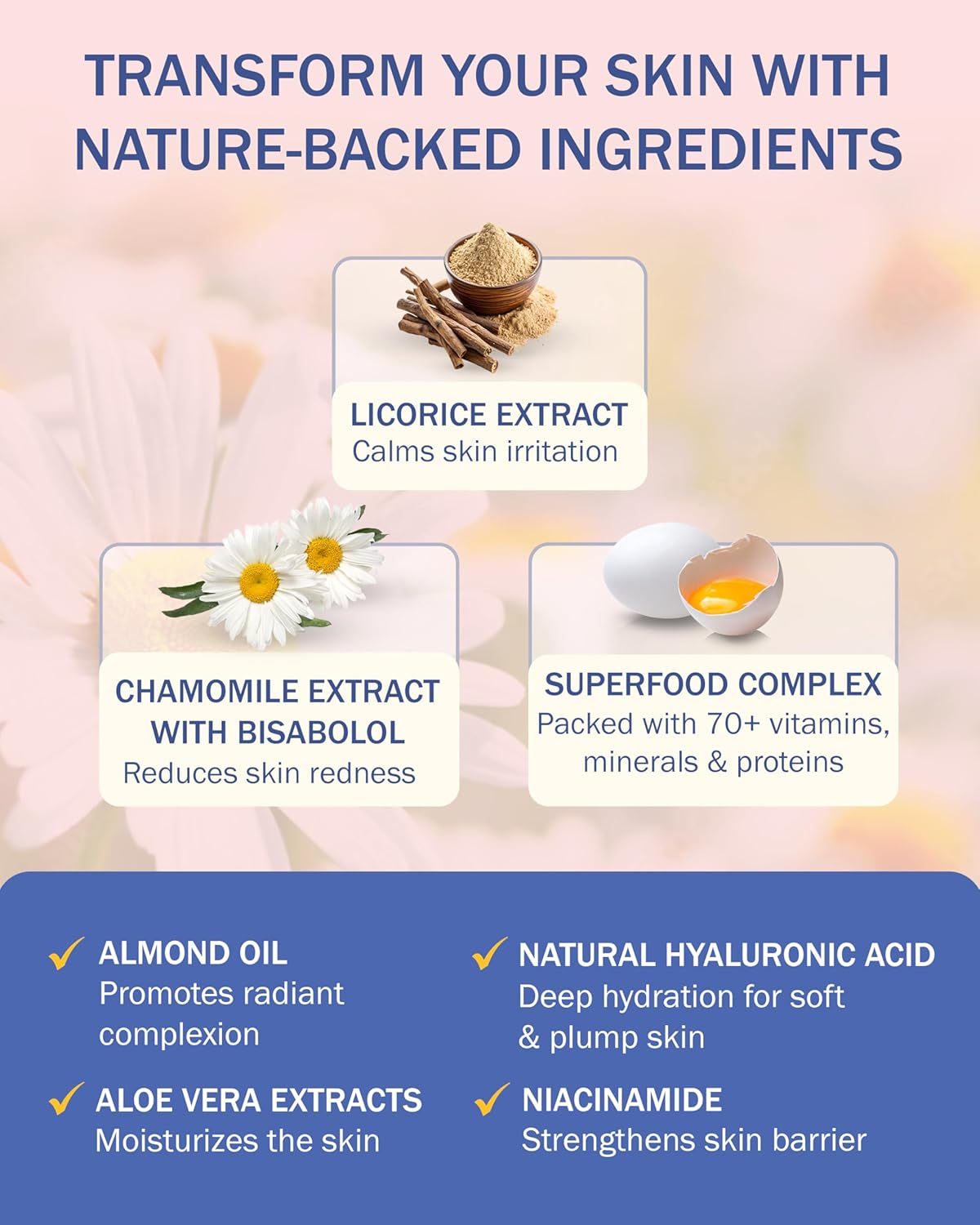 - Potent Natural Ingredients: Infused with licorice, chamomile extracts, aloe vera, and hyaluronic acid, our dry face moisturizer restore and strengthen the skinβs natural barrier for a lasting hydration and protection.