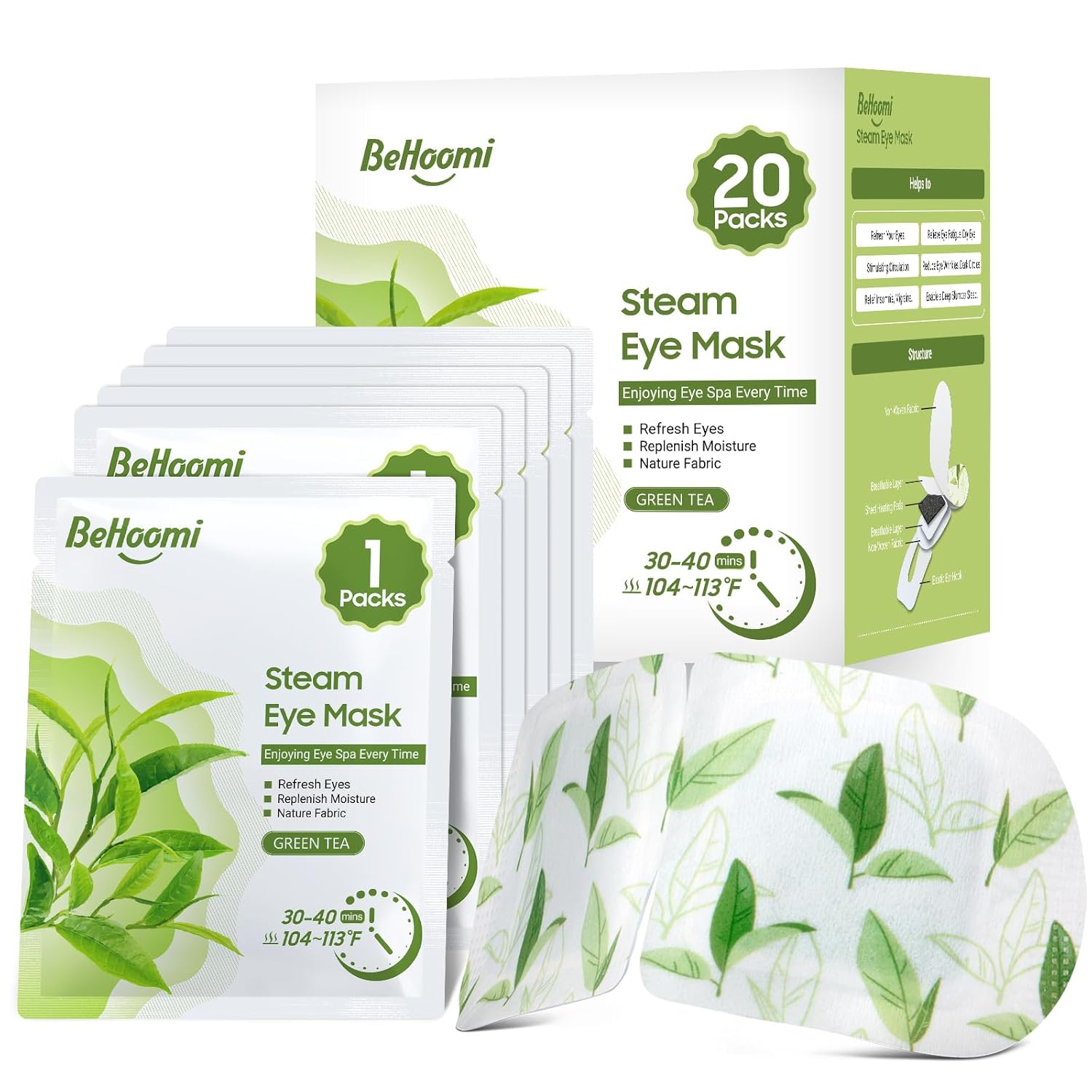 - Self Heating Steam Eye Mask:2 Steps to use BeHoomi Steam eye mask, just open and put on, no need microwave or electric, an easier way to refresh your eyes. Moist heated Eye masks warm eye compress is comfortable to wear.