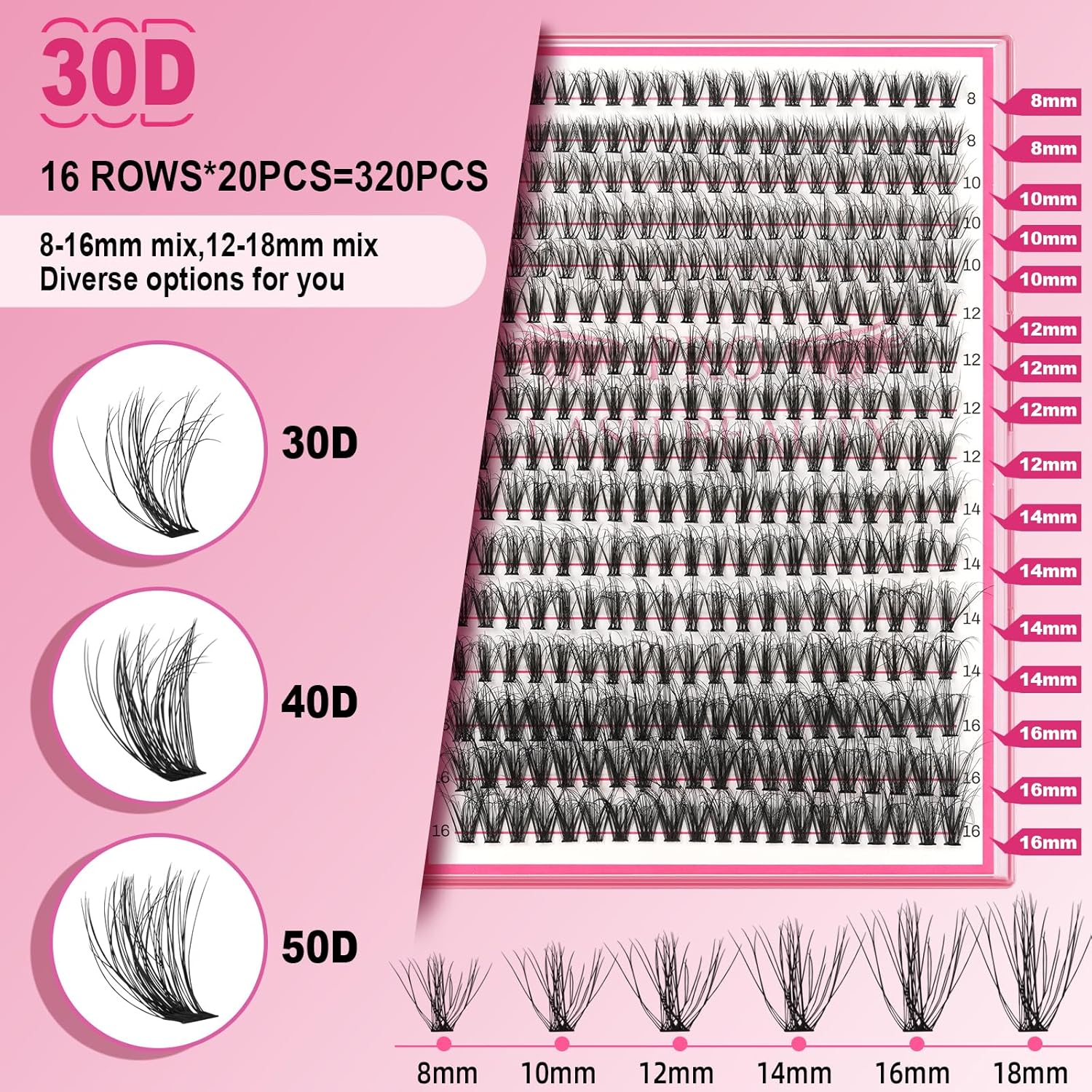 Lash CIusters 320Pcs Individual Lashes 3D Volume Cluster Lashes Natural Look Eyelash Clusters Faux Mink Wispy Lashes 30D-D Mixed DIY Lash Extension (3D Volume-30D-D,8-16mix)
