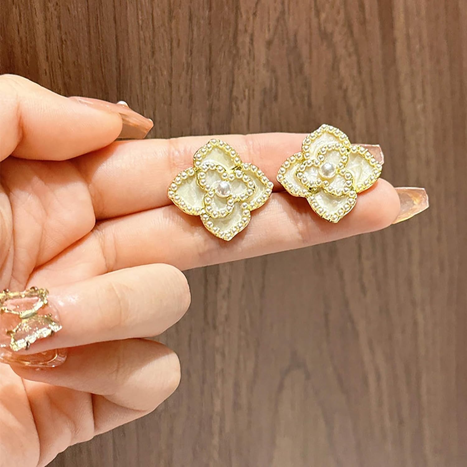 Vintage Pearl Flower Earrings Gold Pearl Stud Earrings Large Camellia Earrings Enamel Camellia Flower Petal Earrings Jewelry for Women