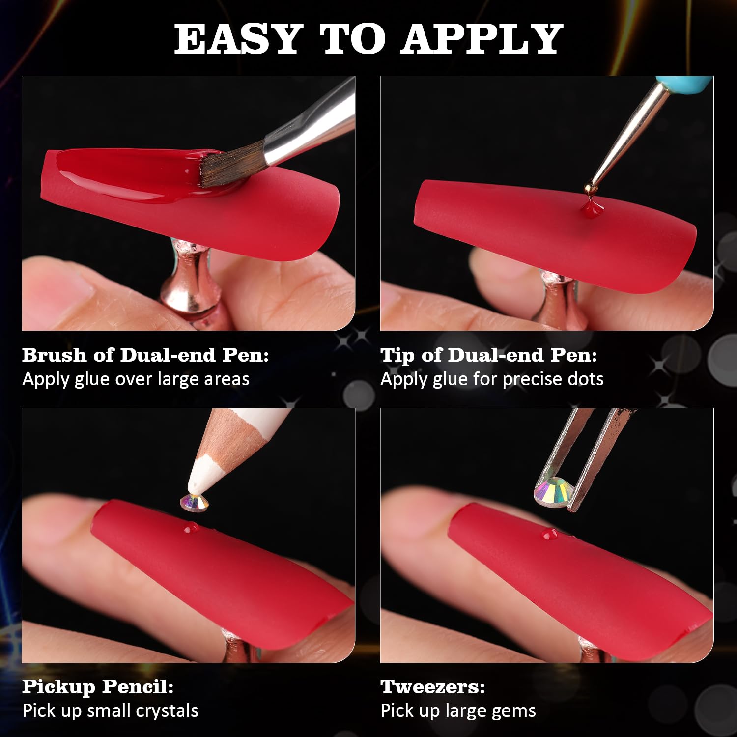 - 💎MULTIFUNCTIONAL TOOLS -- The wide-head brush end of the dual-end dotting tool makes it easy to apply a large amount of your nail polish to the nail surface at once, while the other mini dotting end is great for detailed drawing. Picker pen can help you handily pick up small nail stones, while tweezer is a better choice for big beads. The flatback gems are not self-adhesive and glue-needed. (glue is not included.)