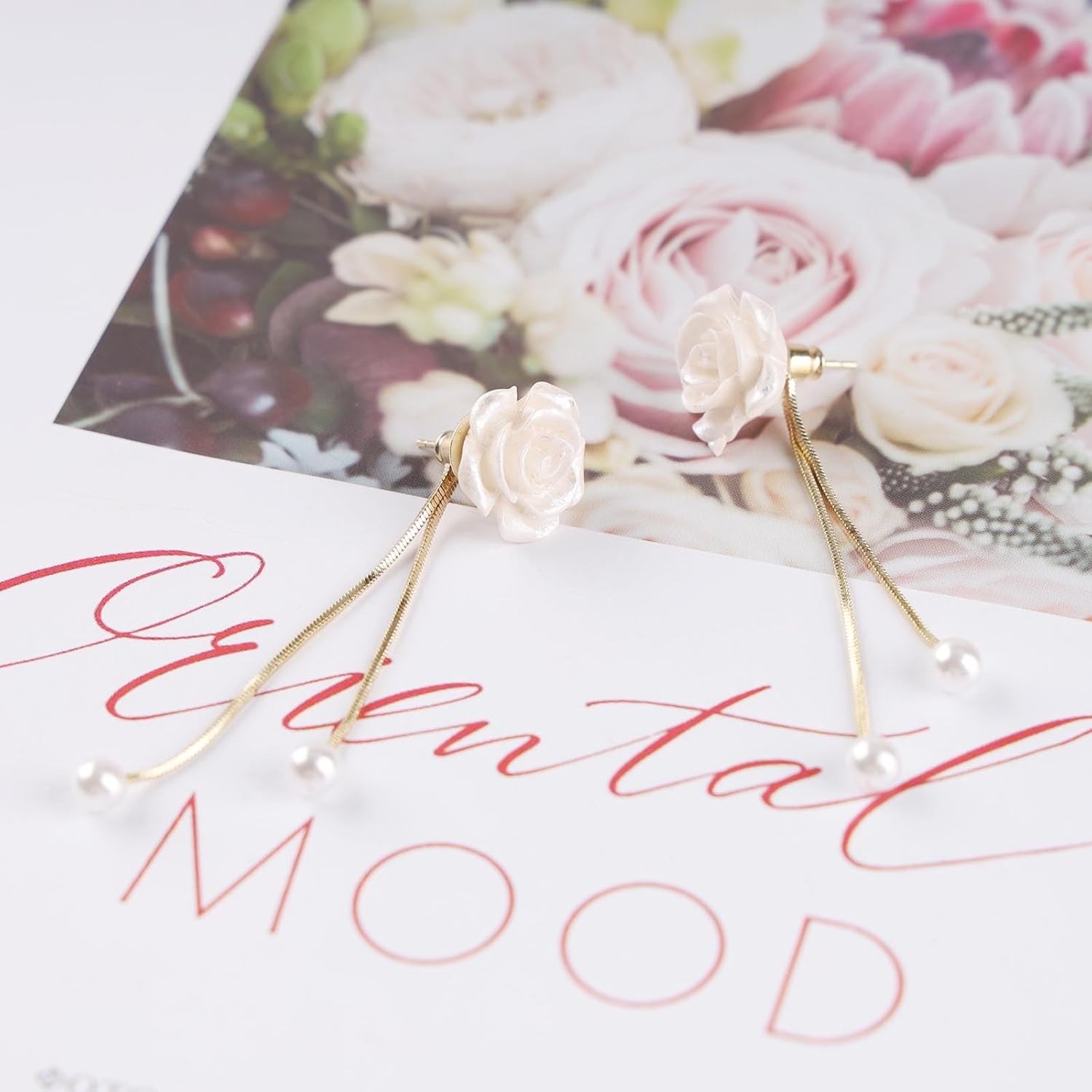 Vintage Flower Pearl Drop Earrings Long Tassel Pearl Earrings White Camellia Stud Earring Gold Pearl Chain Dangle Earrings Jewelry for Women