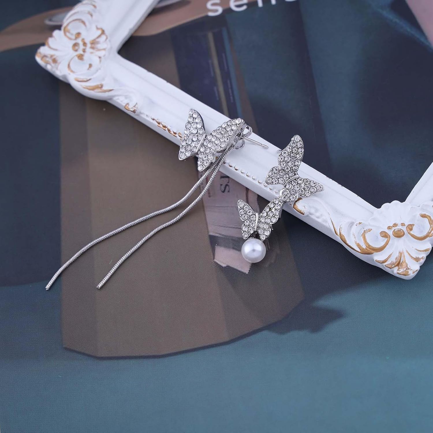 - Rhinestone butterfly drop earrings.Item Details:Handmade Item.Size:As Shown.Color:Silver.Materials:Quality Alloy/Crystal.Location:Ear.Style:Boho/Vintage.