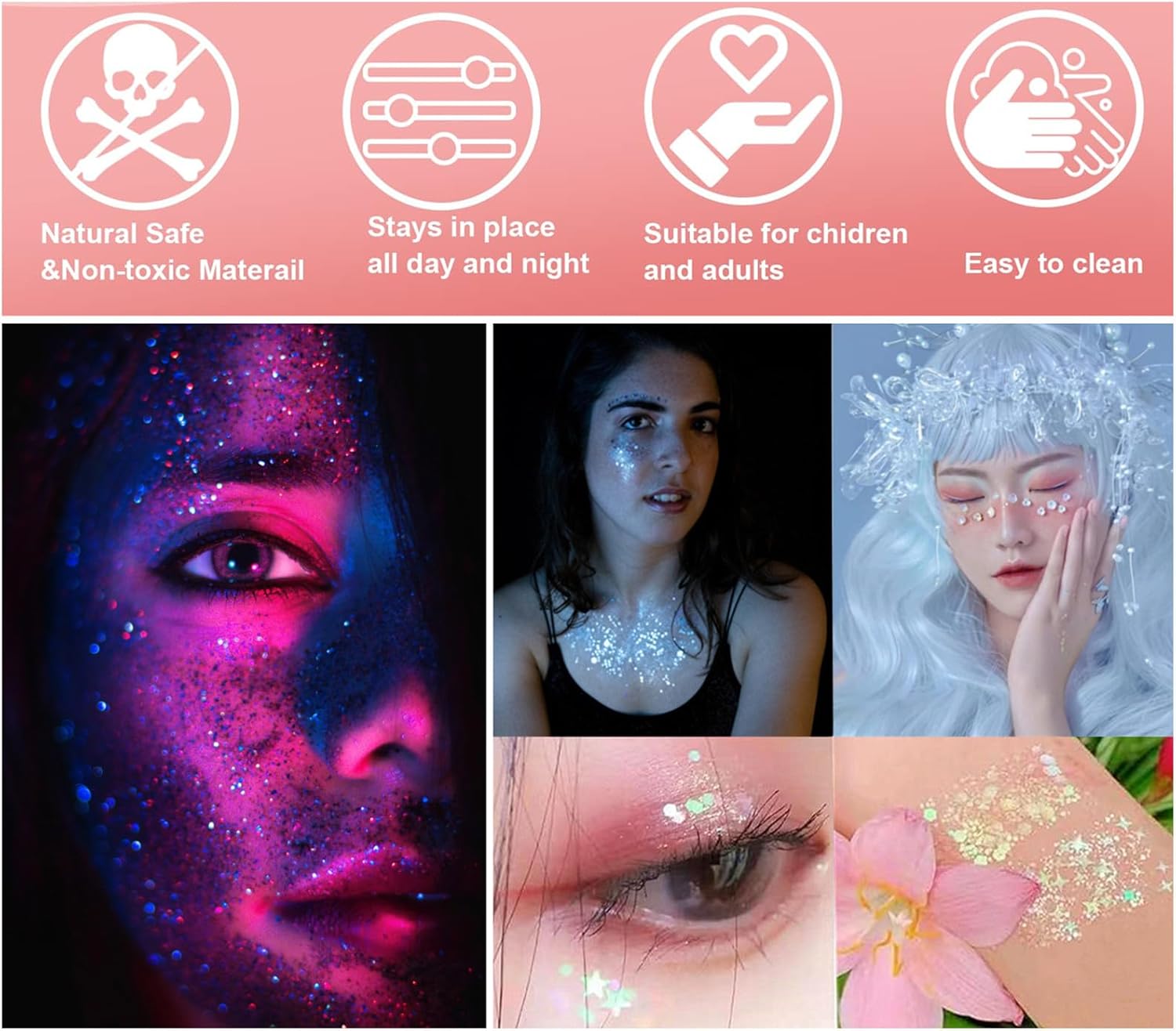 - 【Wide Used Glitter Holographic Effect】Unique colors,rich with small stars and different size hexagonal sequins in it,will see shiny after the glue dry,the sequins glitter makeup effect films like a rainbow,looks signature Hologram Sparkle.It shines brightly on the face, shoulders, and clothes, creating a strong festive atmosphere.A great choice of Singer Concerts Music Festival Rave Accessories.